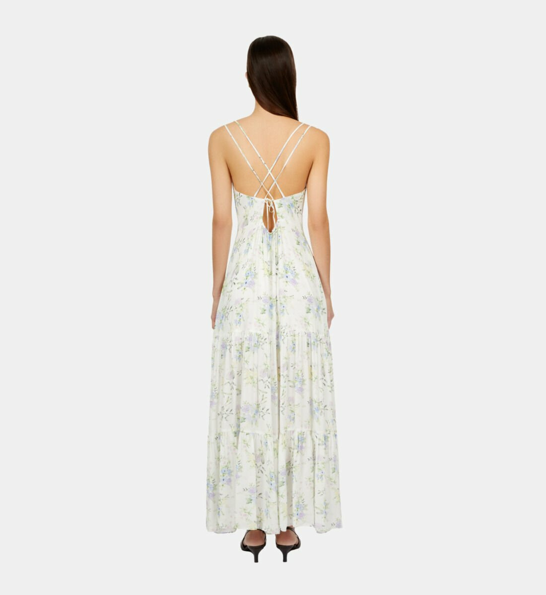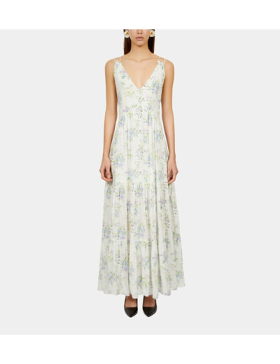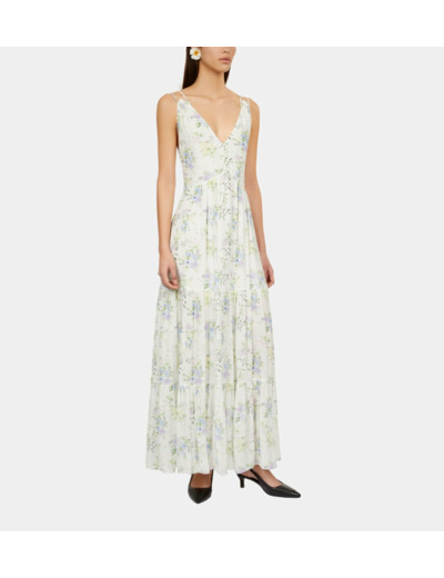 Sublimez votre silhouette avec cette robe longue imprimée qui allie élégance et légèreté. Son laçage au dos et ses volants délicats apportent une touche féminine et raffinée à votre allure.