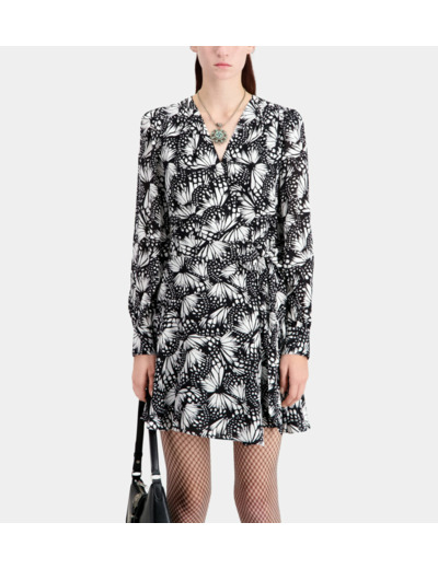 Sublimez votre silhouette avec cette robe portefeuille courte au charme intemporel. Son imprimé papillons noir et blanc apporte une touche d’élégance naturelle à chaque mouvement.