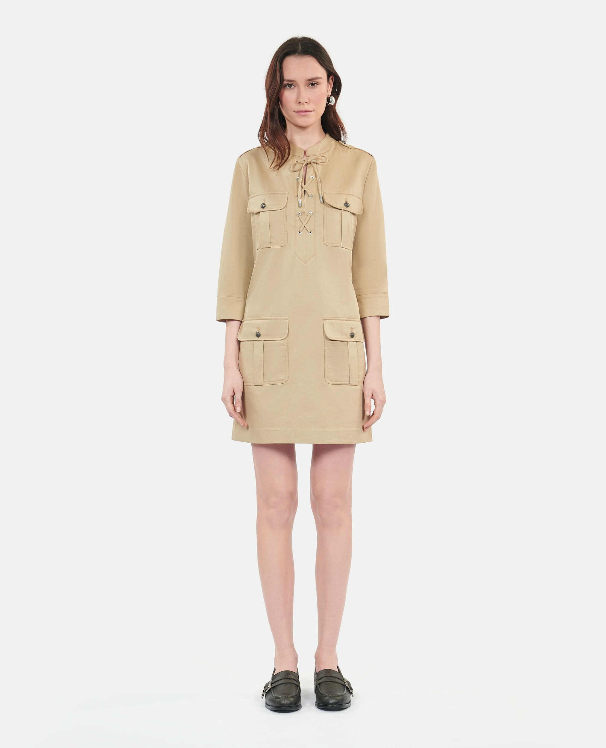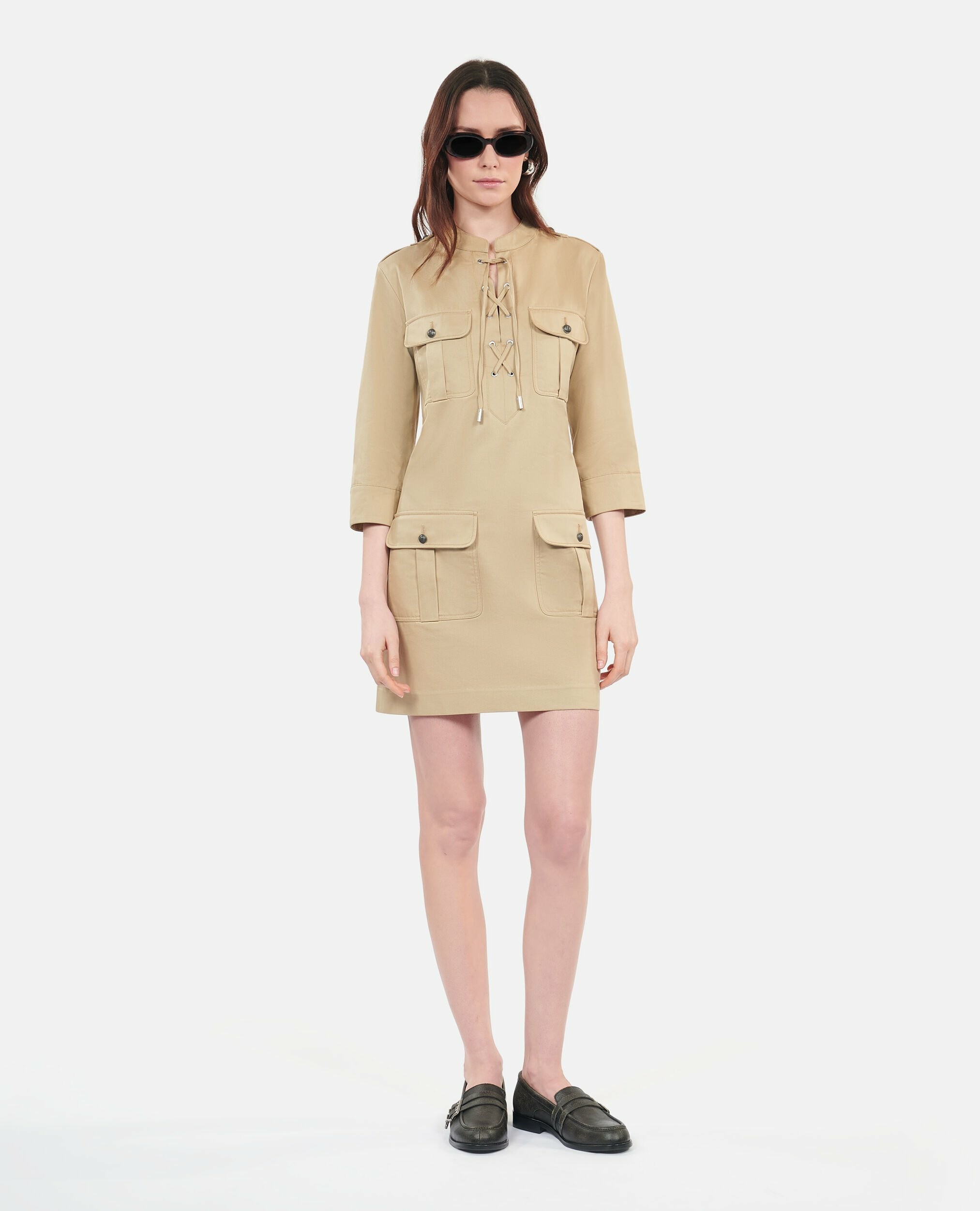 Adoptez l’élégance décontractée avec cette robe saharienne courte beige signée The Kooples. Une pièce intemporelle qui allie style affirmé et confort au quotidien.