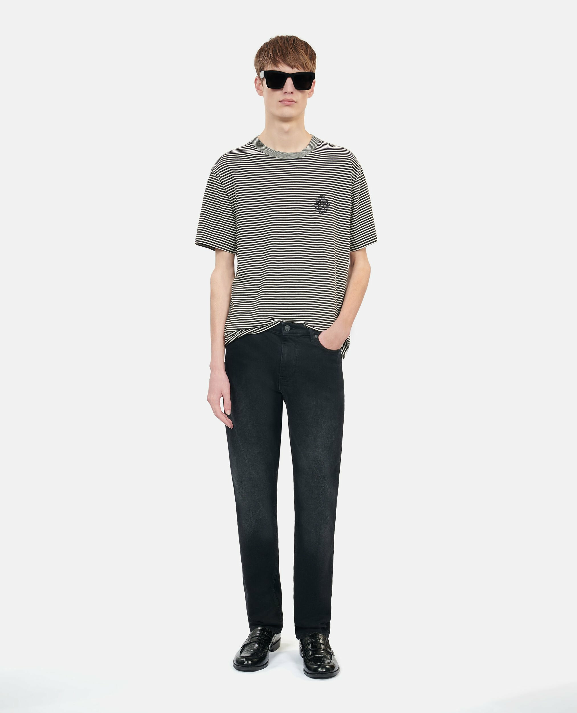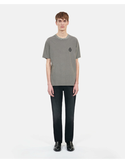 Conçu pour l’homme qui aime allier confort et élégance, ce T-shirt arbore des rayures noires et blanches intemporelles, rehaussées par un blason distinctif sur la poitrine. Sa coupe droite et son col rond offrent une silhouette nette, facile à porter au quotidien, que ce soit sous une veste ou seul pour un style casual affirmé.