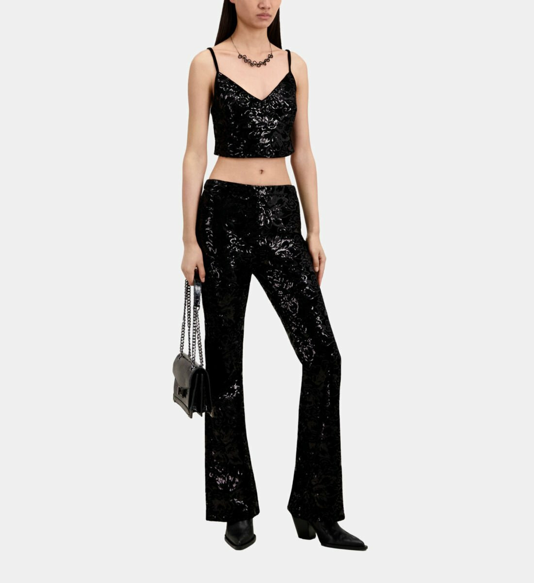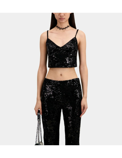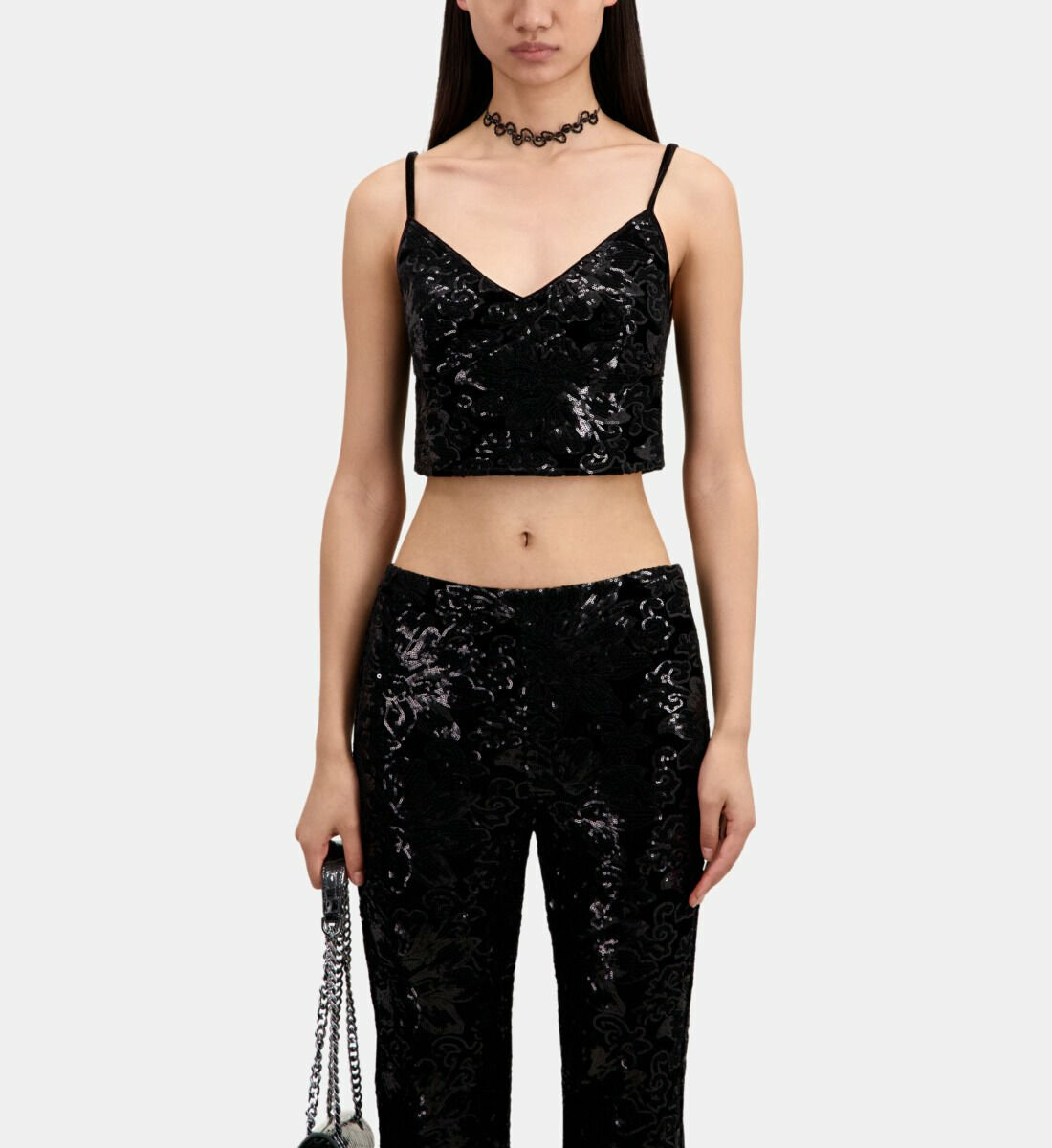 Sublimez votre allure avec ce top court noir en velours, orné de sequins délicatement brodés. Une pièce audacieuse qui allie élégance et modernité pour sublimer vos soirées.