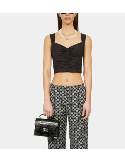 Sublimez votre silhouette avec ce top noir à la fois audacieux et élégant. Son drapé sophistiqué et son décolleté cœur apportent une touche de féminité affirmée à toutes vos tenues.