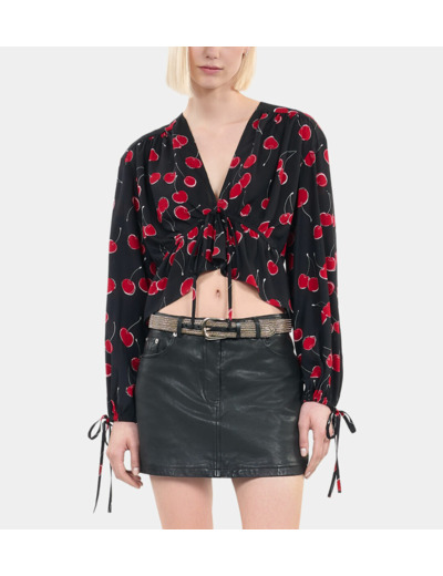 Confectionné dans une viscose fluide, ce top ample se distingue par son imprimé cerises noir et rouge qui dynamise instantanément votre tenue. Le col en V avec laçage et les manches longues ornées de détails similaires ajoutent une élégance subtile, parfaite pour un look casual chic ou une sortie en soirée.
