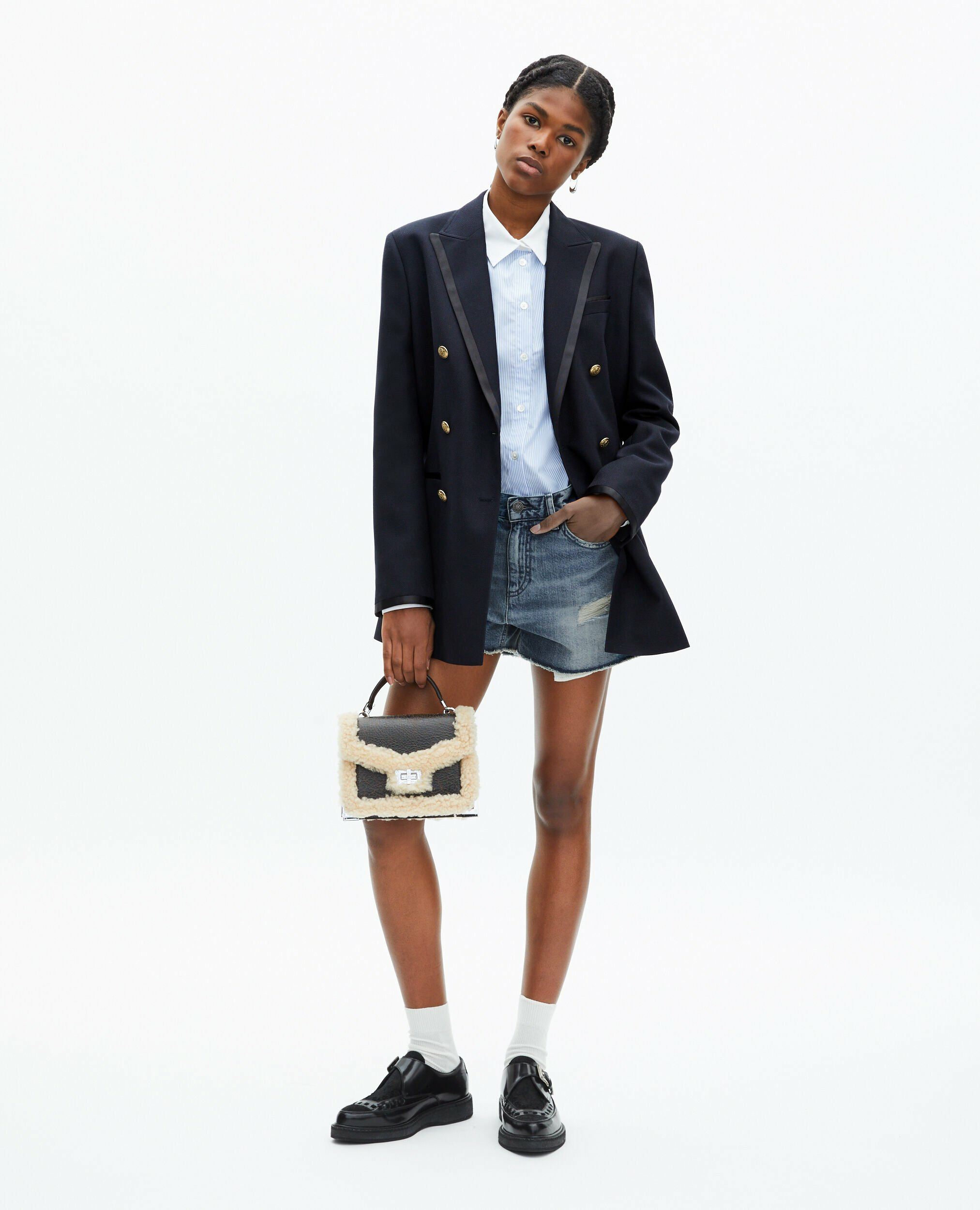 Conçue en laine mélangée, cette veste épouse délicatement la silhouette grâce à sa coupe légèrement cintrée. Son col cranté et ses manches longues apportent une touche sophistiquée, tandis que les galons contrastés et les boutons héritage soulignent son style unique et raffiné. Polyvalente, elle s’adapte aussi bien à un look professionnel qu’à une tenue plus décontractée.