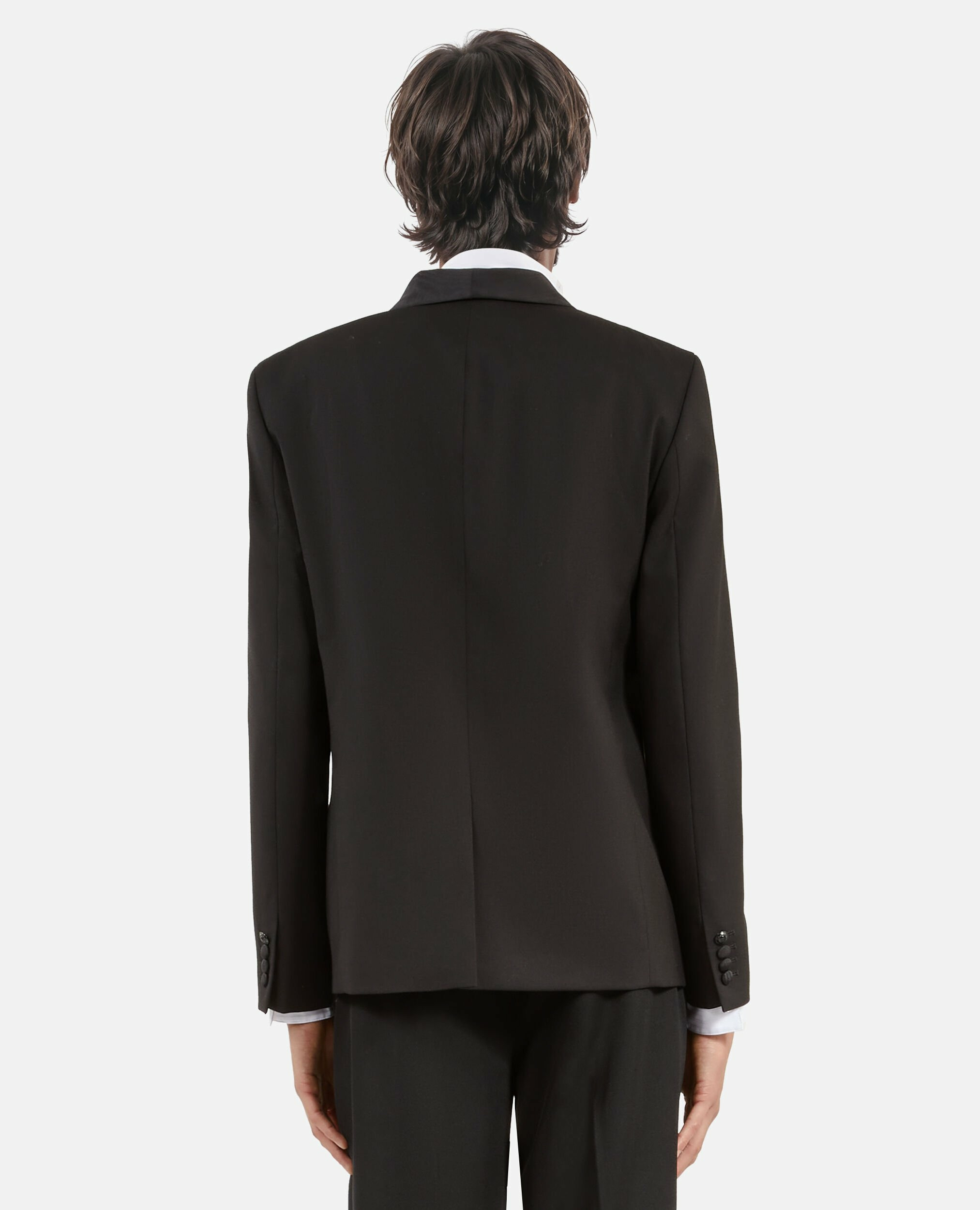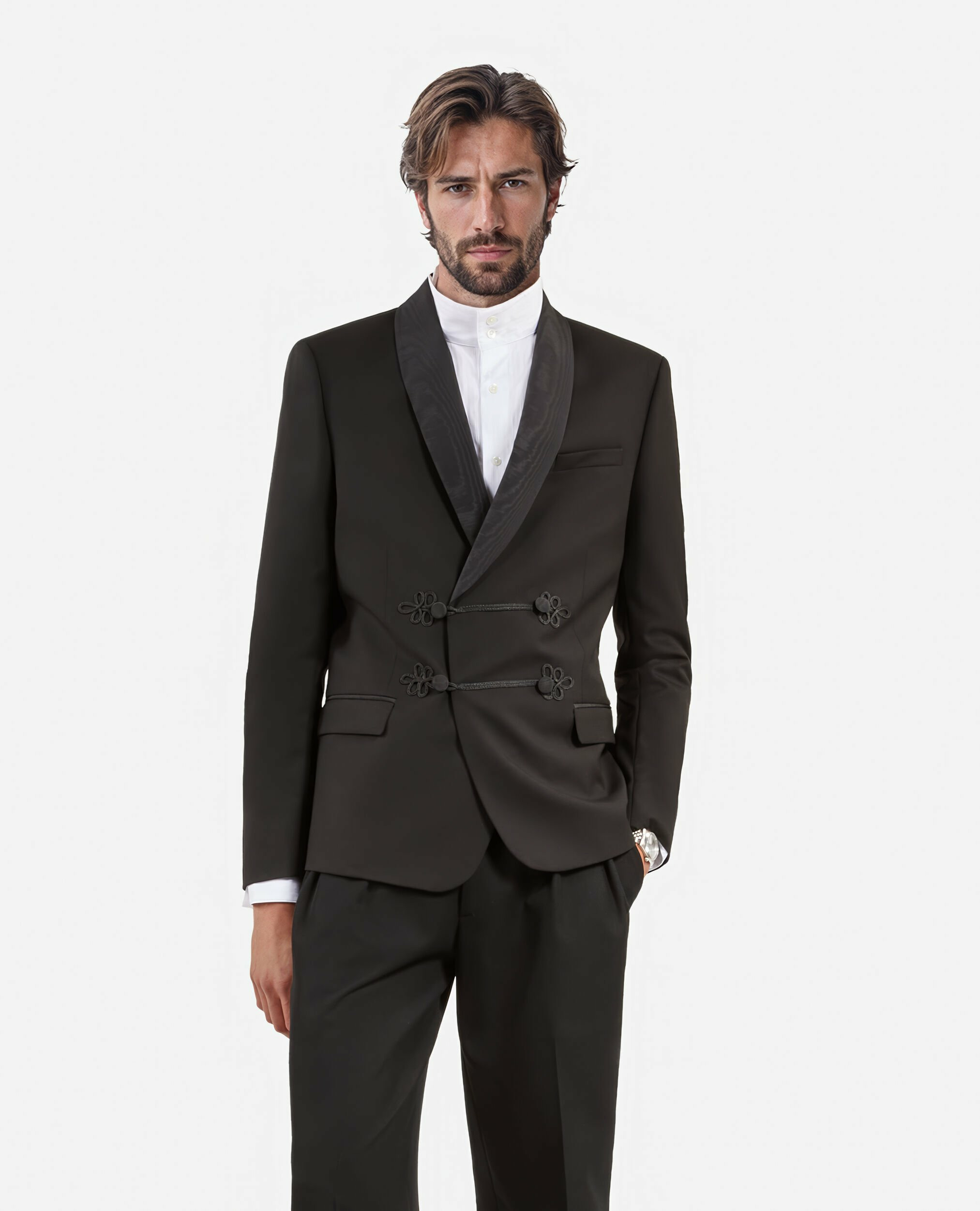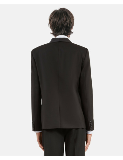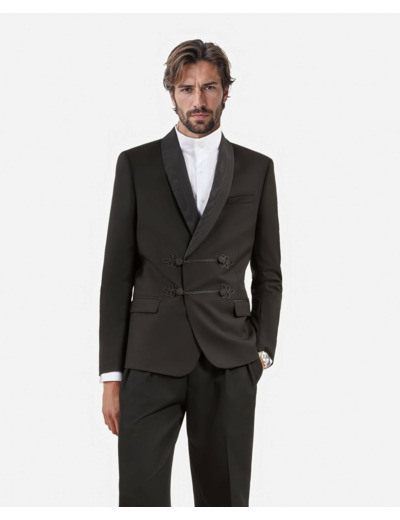Réponse : Boutons recouverts, brandebourgs, poches passepoilées et à rabat, fente au dos pour une meilleure liberté de mouvement.