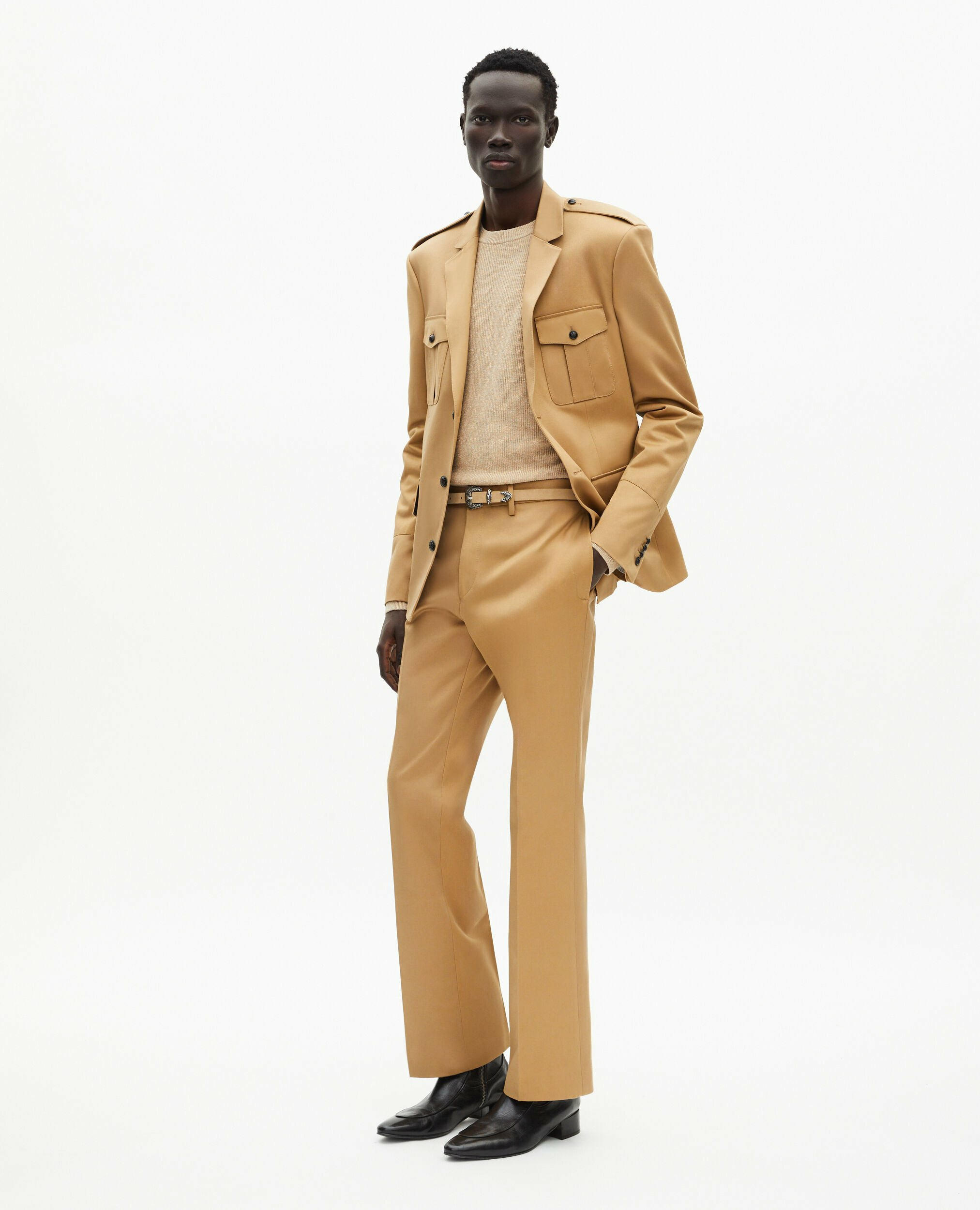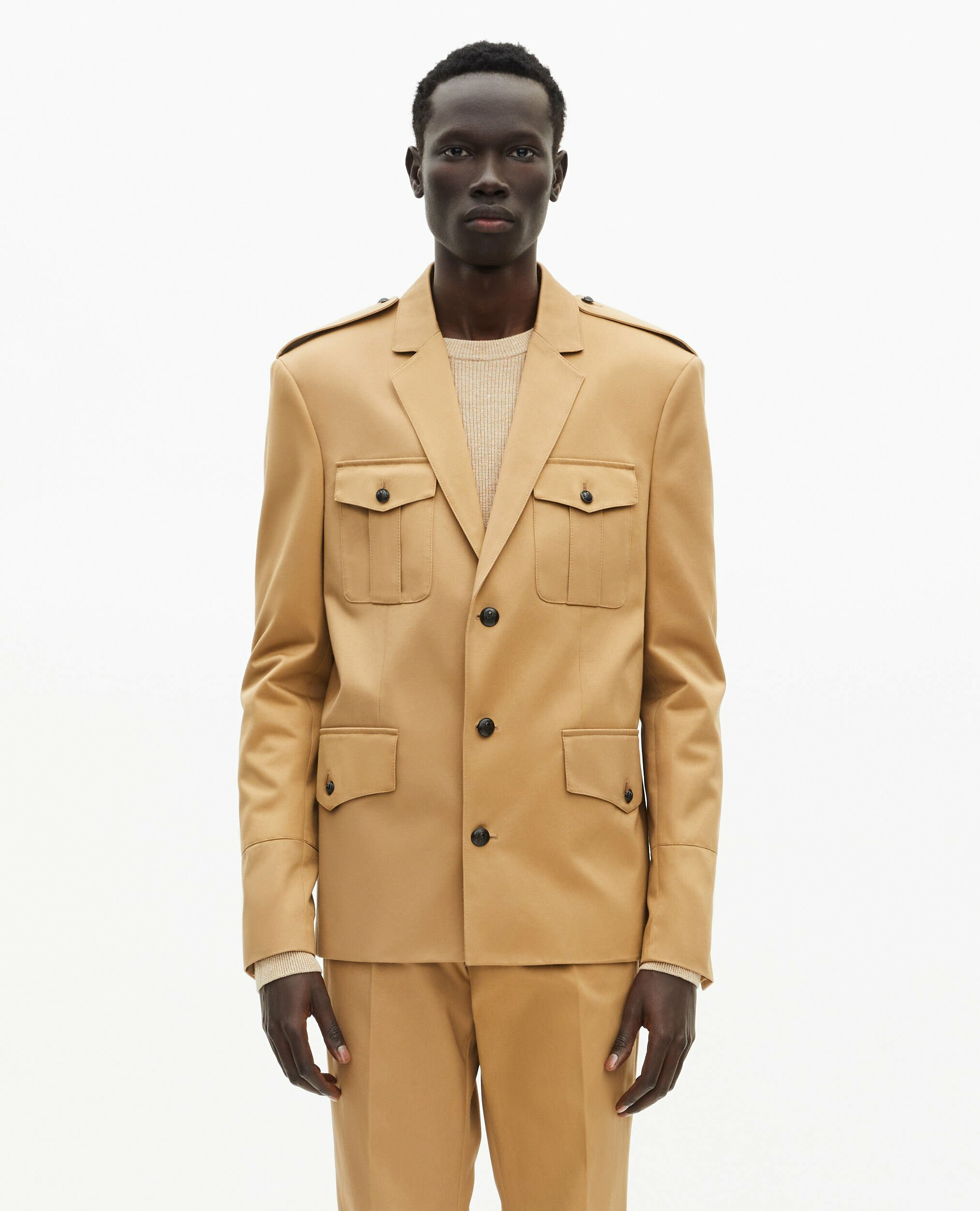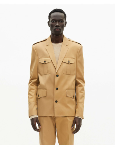 Réponse. Les pattes d’épaule et les poches à rabat reprennent les codes militaires avec élégance.