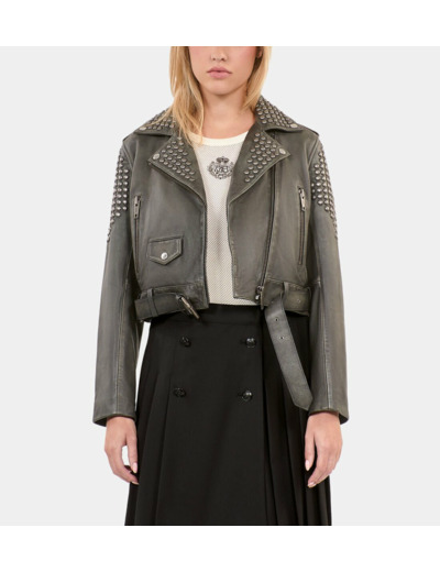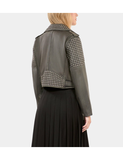 Confectionné en cuir mouton lisse, ce blouson se distingue par ses clous gunmetal qui apportent une touche rock sophistiquée. Le col cranté, les pattes d’épaule et la ceinture à la taille renforcent son allure structurée, tandis que les manches longues et la fermeture zippée garantissent confort et praticité au quotidien.