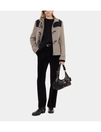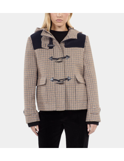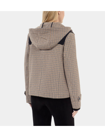 Manteau court pour femme, motif pied de poule beige, doté d’une capuche. Marque : The Kooples. Composition et entretien non spécifiés.