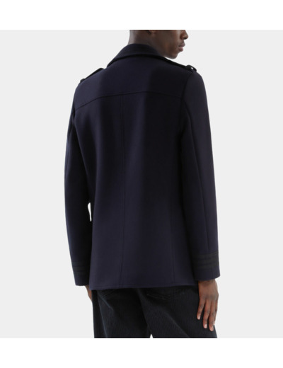 Conçu pour l’homme contemporain, ce caban présente une coupe droite parfaitement structurée, sublimée par des revers en pointe et des pattes d’épaule qui renforcent sa silhouette. La fermeture double boutonnage et les poches passepoilées à rabat ajoutent une touche fonctionnelle et esthétique, tandis que les galons contrastés apportent un détail raffiné et distinctif.