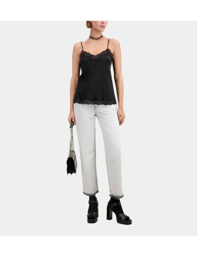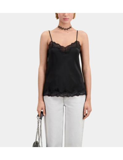 Confectionné en soie fluide, ce top dévoile un décolleté en V à l’avant comme au dos, souligné par des fines bretelles ajustables pour un maintien personnalisé. Les détails en dentelle apportent une touche raffinée et féminine, parfaite pour une allure sophistiquée aussi bien en journée qu’en soirée.