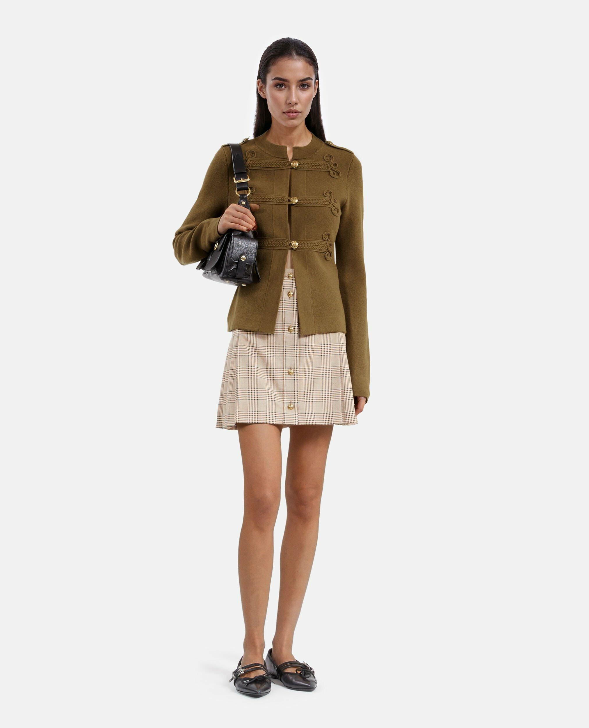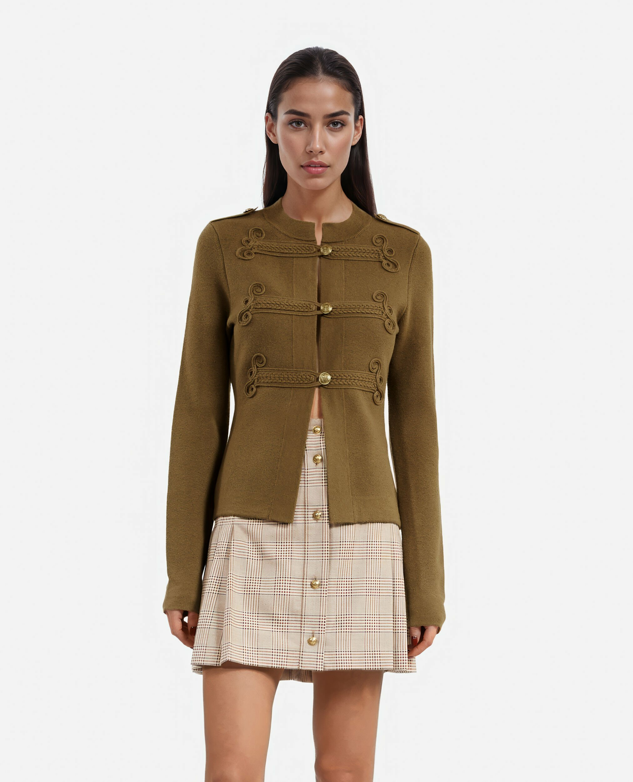 Ce cardigan à coupe droite se distingue par son col officier et ses pattes d’épaule qui apportent une touche militaire subtile et sophistiquée. Les manches longues et le boutonnage devant, agrémenté de boutons héritage, renforcent son caractère unique. La coupe ajustée souligne délicatement la silhouette, tandis que les brandebourgs ajoutent un détail d’exception, parfait pour une allure soignée en toute occasion.