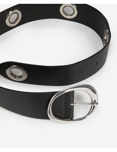 Conçue en cuir lisse de qualité, cette ceinture se distingue par sa métallerie argentée et ses œillets qui apportent un détail graphique et affirmé. Sa largeur de 5 cm lui confère une présence marquée, parfaite pour structurer vos looks, qu’ils soient casual ou plus habillés. La finition impeccable et la robustesse du cuir garantissent une durabilité à toute épreuve.