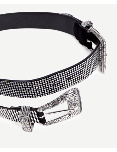 Conçue pour les passionnés de mode, cette ceinture impose son caractère grâce à son cuir de qualité et ses détails métalliques argentés brillants. Sa double boucle western apporte une dimension unique, parfaite pour rehausser un jean ou structurer une robe fluide. L’alliance du cuir et des strass crée un équilibre subtil entre robustesse et éclat, idéal pour un look affirmé sans effort.