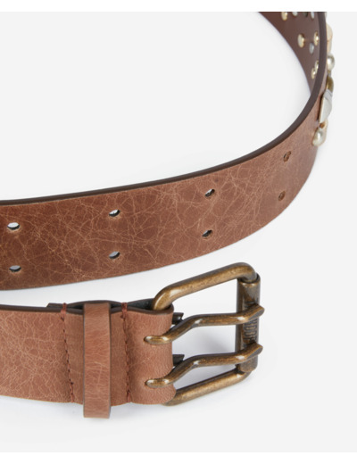 Conçue pour sublimer la silhouette féminine, cette ceinture joue sur le contraste entre la boucle dorée et les rivets argentés et dorés, pour un effet sophistiqué et moderne. Son cuir à l’aspect vieilli donne une authenticité rare, parfaite pour compléter un look casual ou habillé avec une note rock-chic.