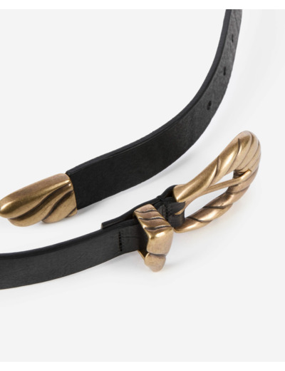 Affirmez votre style avec cette ceinture fine en cuir noir, signée The Kooples, alliant élégance et modernité. Son double boucle dorée gravée apporte une touche distinctive à toutes vos tenues.