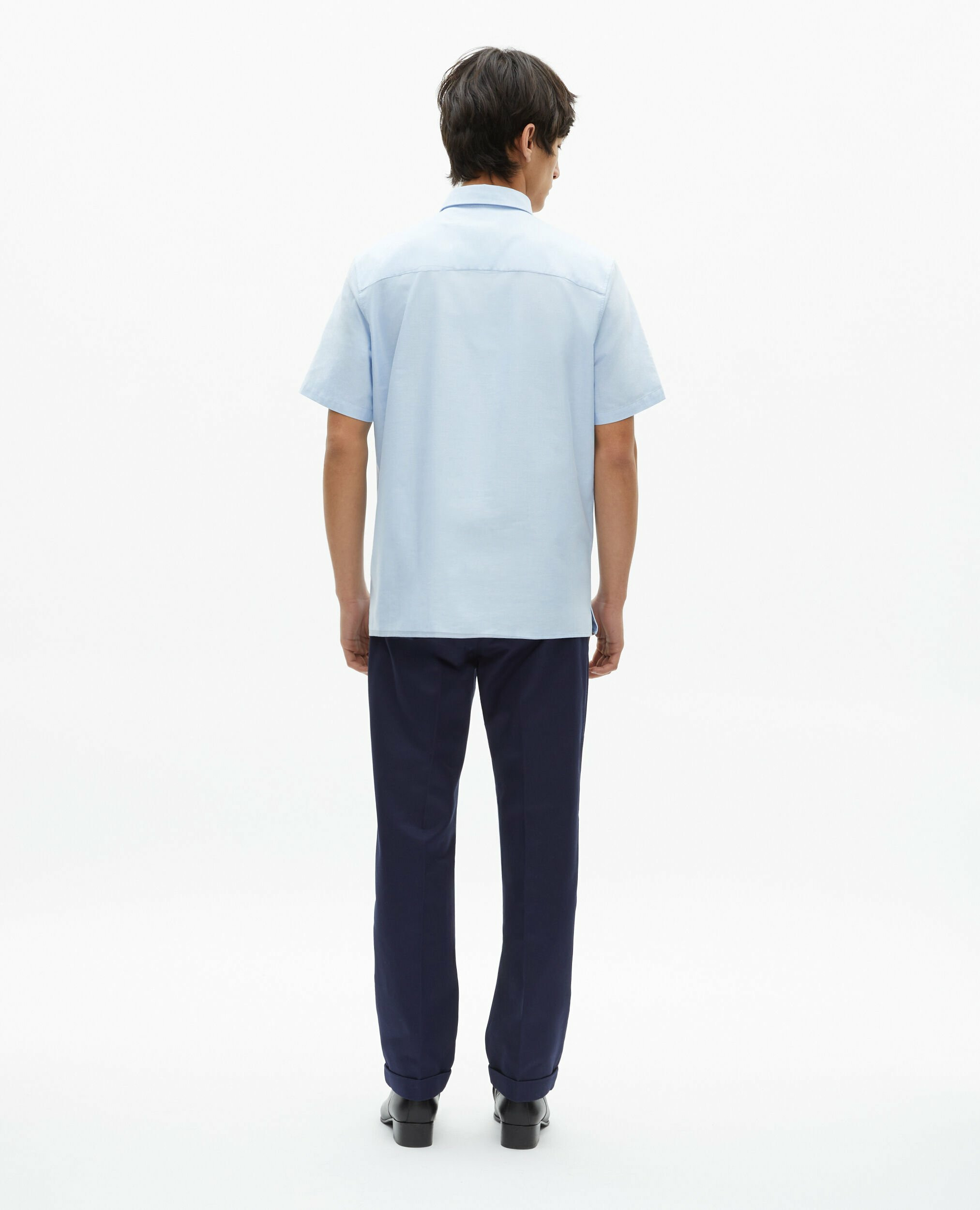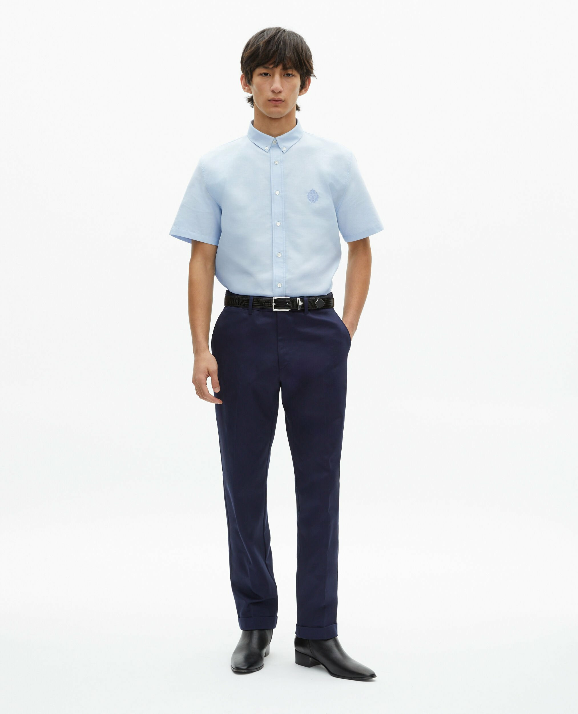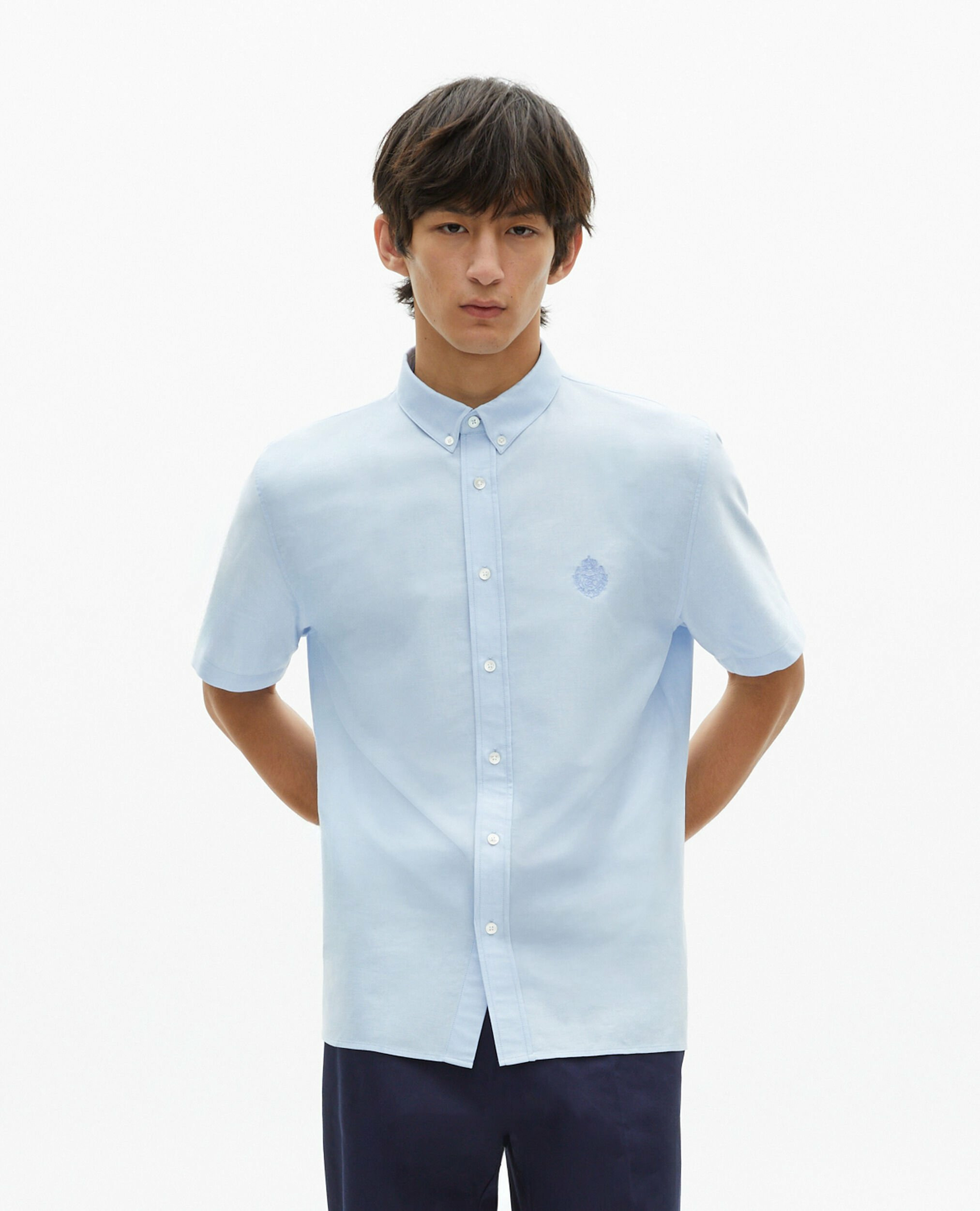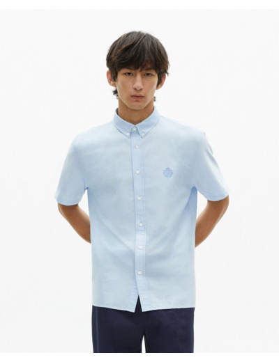 Fabriquée en Oxford, elle présente une coupe droite avec un col classique. Le blason est brodé ton sur ton, la patte de boutonnage est américaine et les boutons sont en nacre.