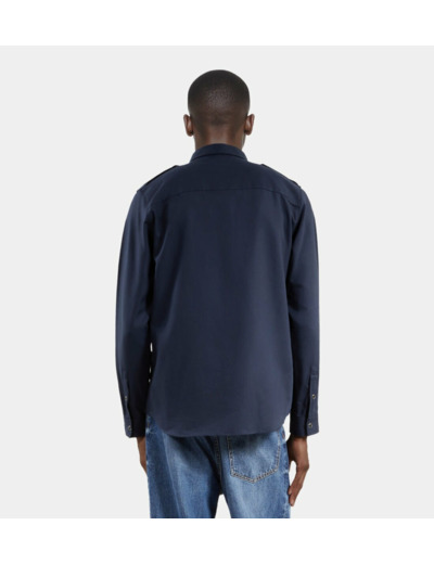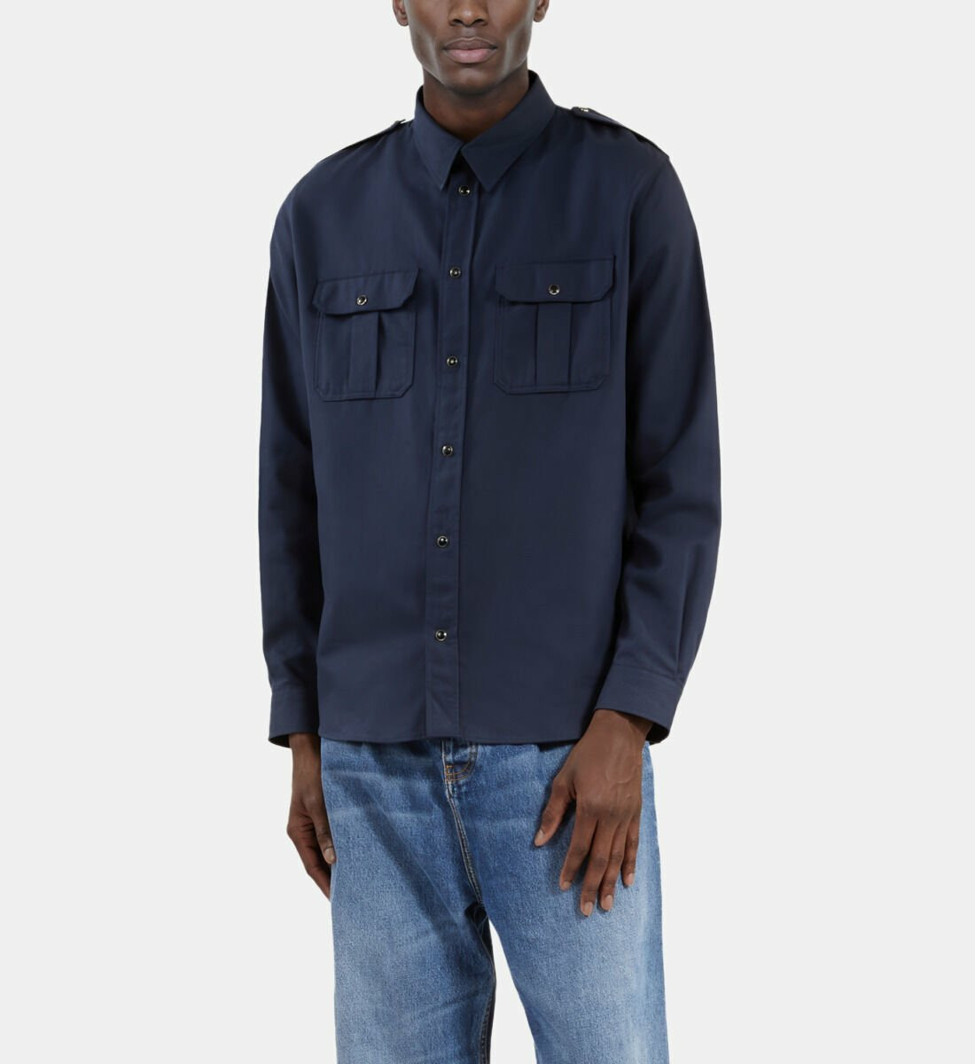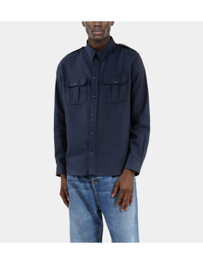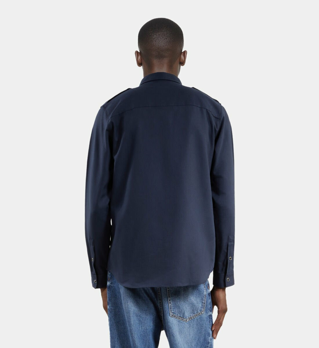 Conçue dans une coupe droite, cette chemise offre un confort optimal tout en structurant la silhouette. Son col classique et ses pattes d’épaule apportent une touche d’autorité discrète, tandis que les manches longues et les poches plaquées à rabat renforcent son caractère fonctionnel et raffiné. La patte de boutonnage américaine et les boutons pression facilitent l’enfilage tout en assurant une finition soignée.