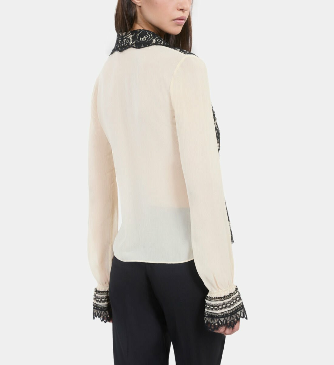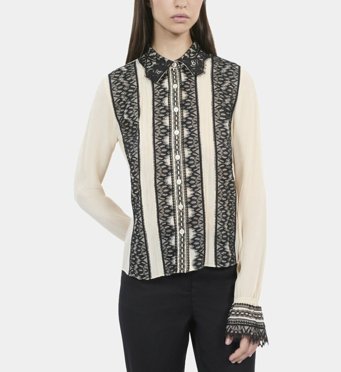 Réponse : La chemise présente une légère transparence due à la dentelle, idéale pour un effet sophistiqué, pensez à un sous-vêtement adapté.