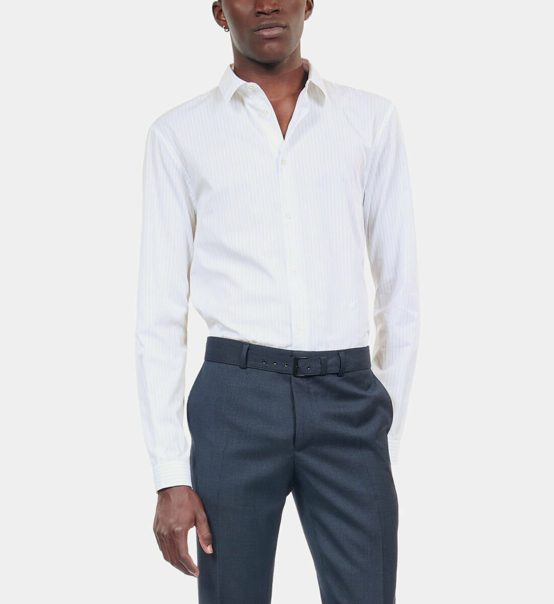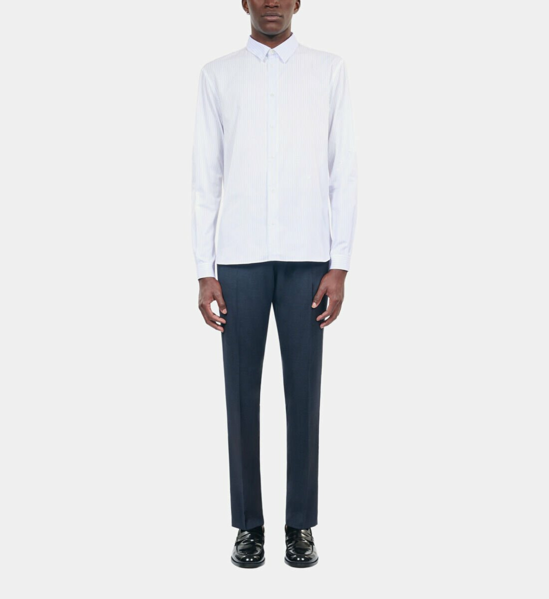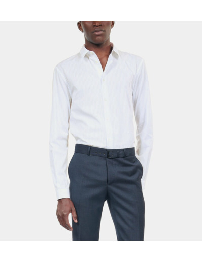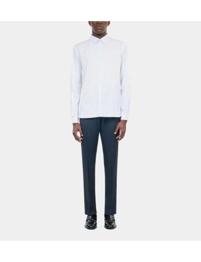 Conçue pour l’homme qui maîtrise son style, cette chemise ajustée dévoile des rayures bleues subtiles sur fond blanc, apportant une touche de sophistication discrète. Le col classique et la patte de boutonnage simple renforcent son allure intemporelle, tandis que les manches longues avec rivet au bas ajoutent une finition précise et élégante.