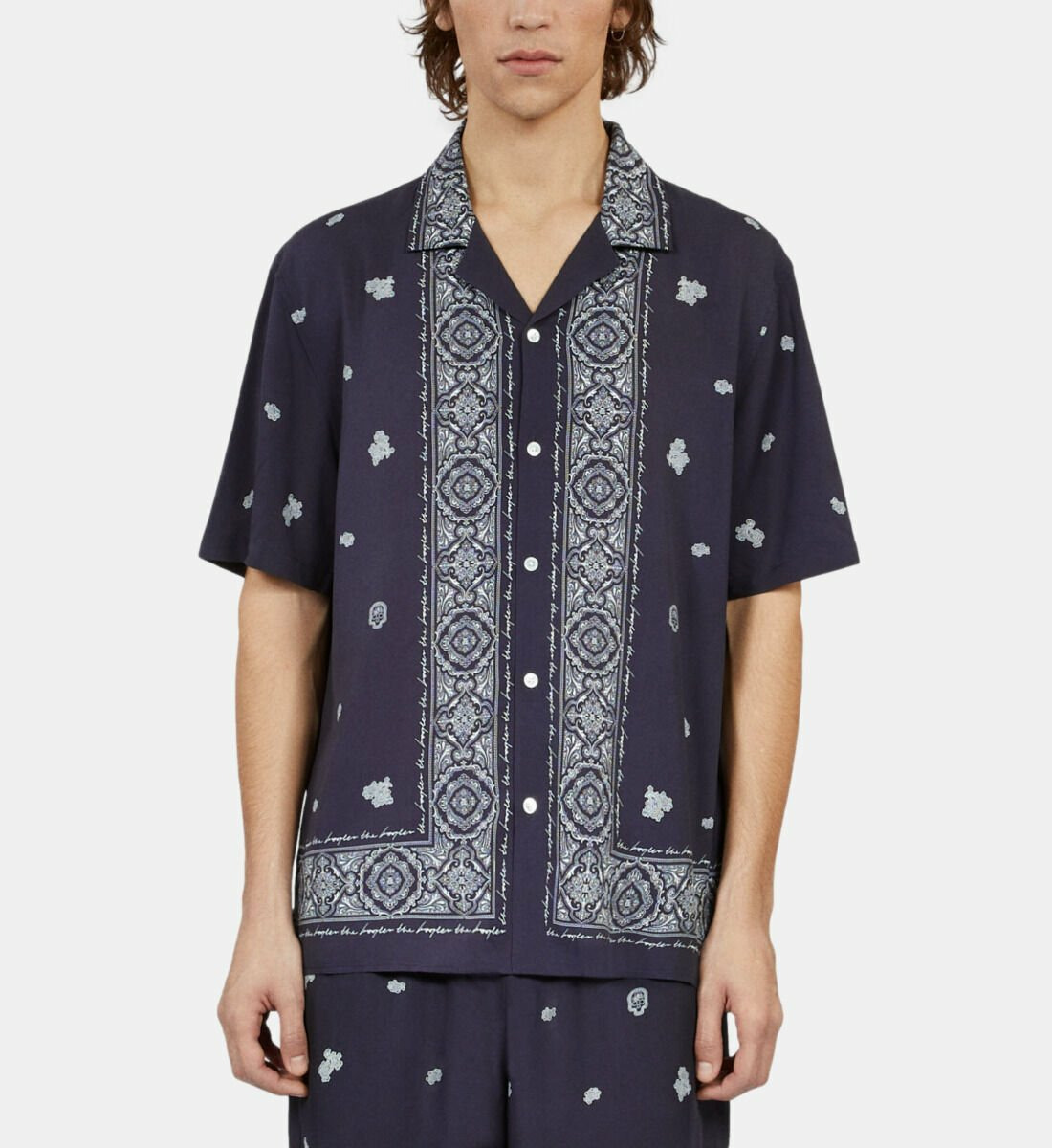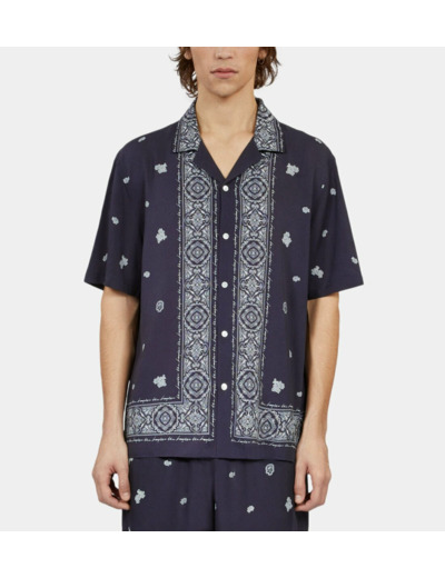 Cette chemise est signée The Kooples, gage de qualité et de style. Elle présente un imprimé paisley bleu marine et écru, une coupe droite, un col hawaïen, des manches courtes, une patte de boutonnage simple et des boutons nacrés blancs. La matière fluide assure un tombé naturel et un confort optimal.