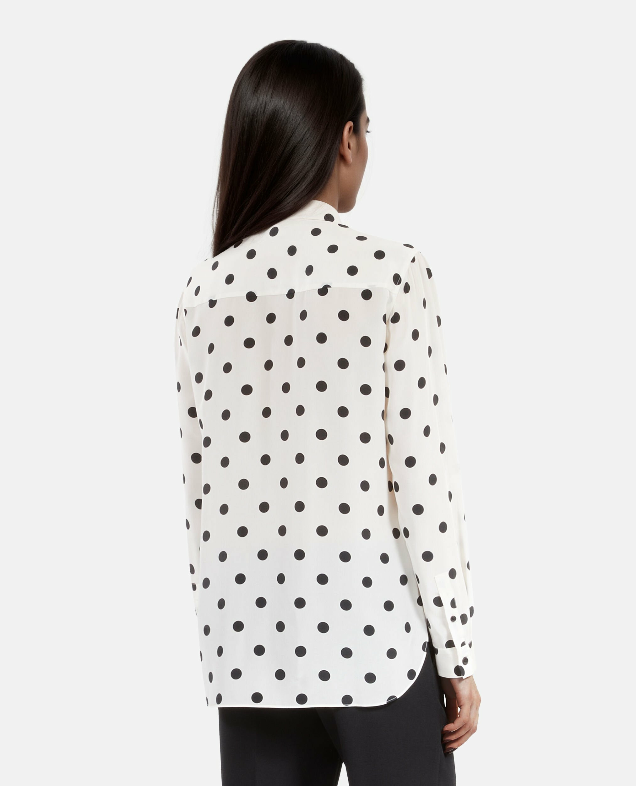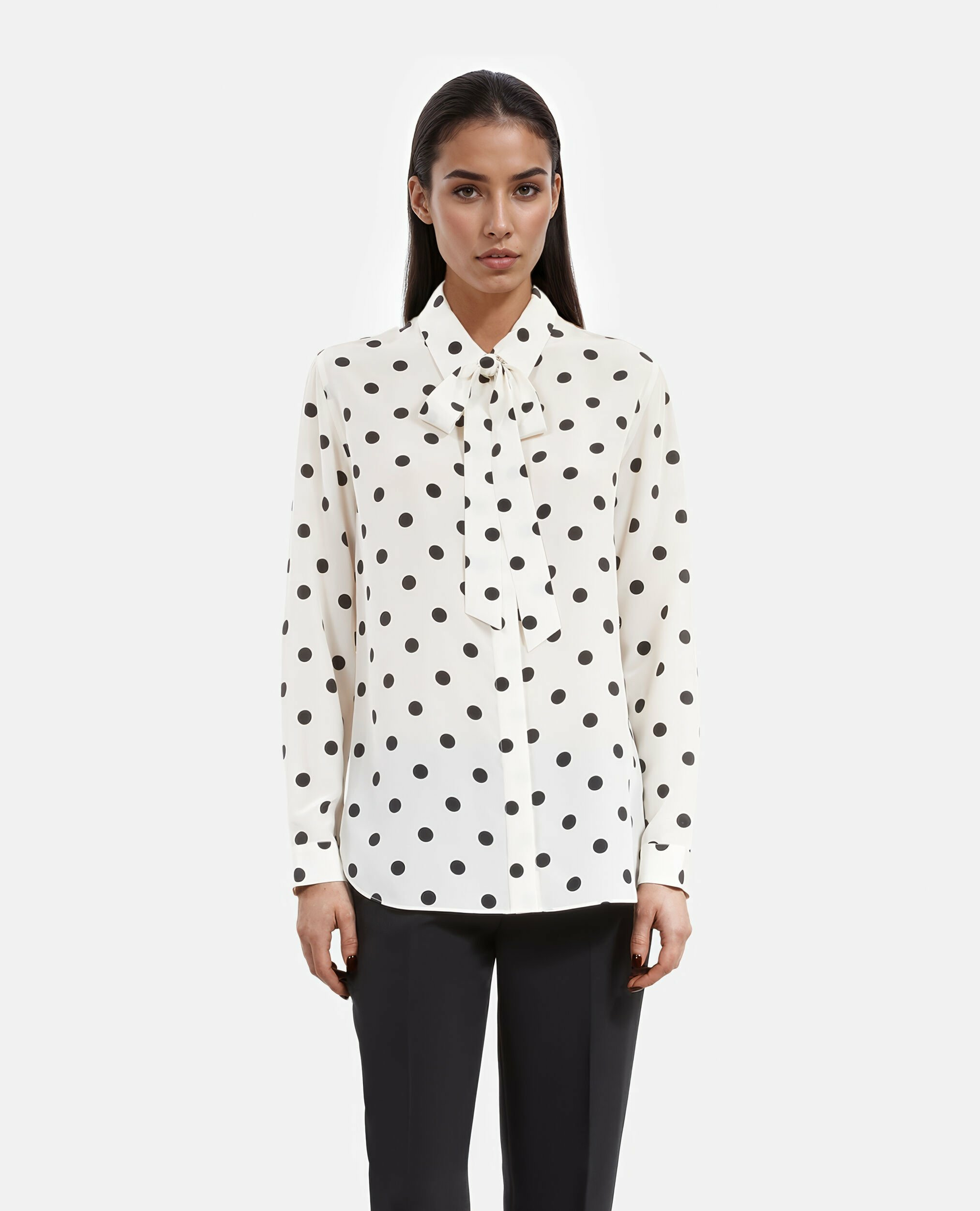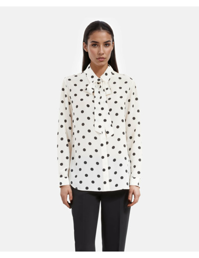 Cette chemise manches longues se distingue par son col lavallière amovible, offrant une polyvalence stylistique unique. Sa coupe ajustée et ses boutons noirs discrets soulignent une allure raffinée, tandis que la patte de boutonnage cachée apporte une touche de modernité et de sobriété. L’imprimé à pois ajoute une note graphique et féminine, parfaite pour dynamiser vos tenues.