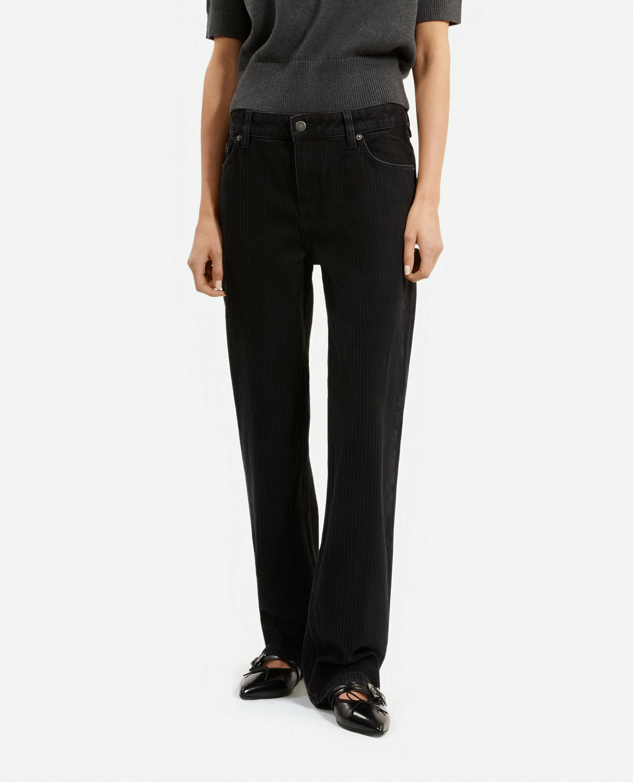 Ce jean femme The Kooples est texturé avec un détail de rayures qui apporte du relief au tissu. Il dispose d’une coupe droite, d’une taille haute équipée de passants, d’une fermeture à zip et de cinq poches classiques.