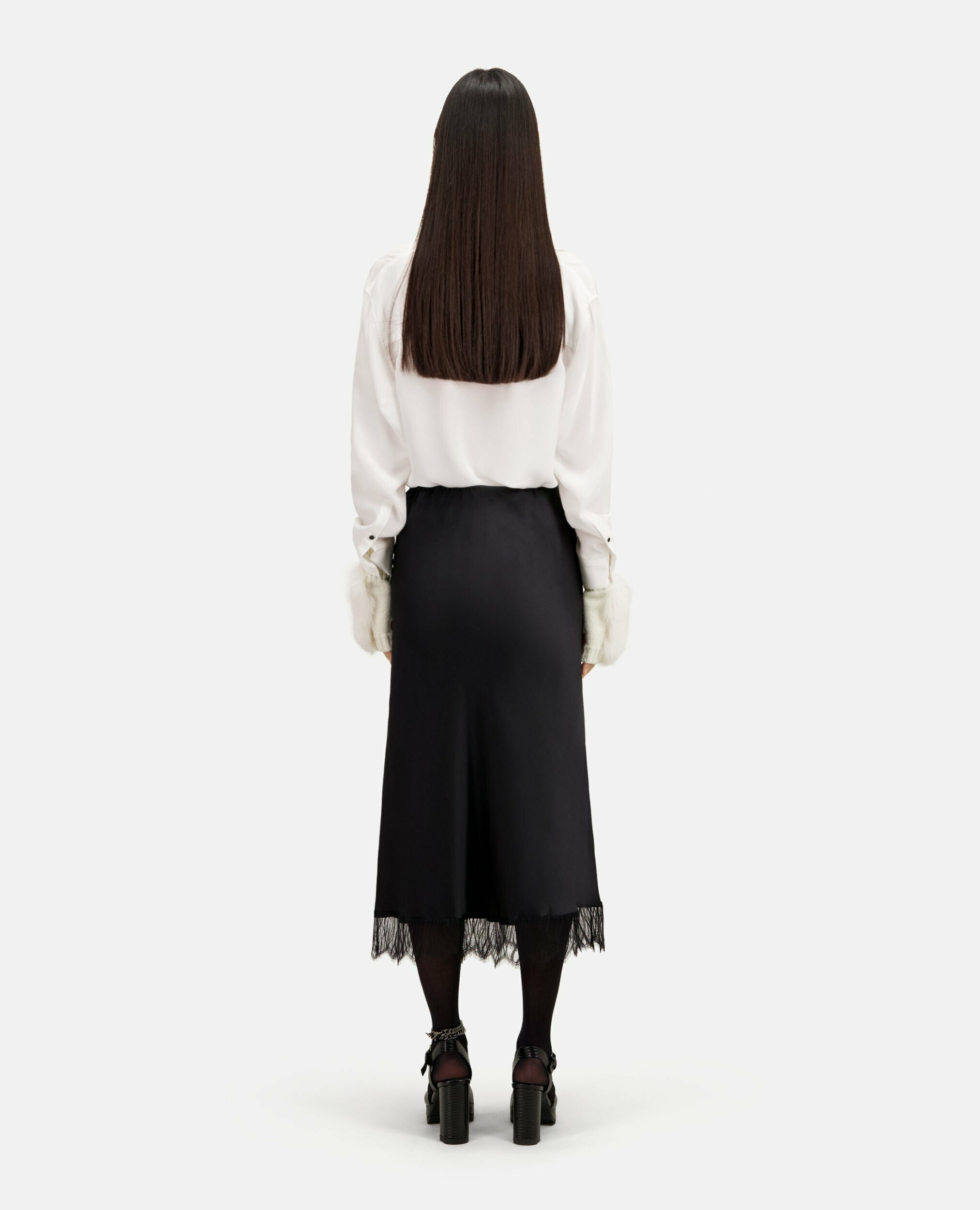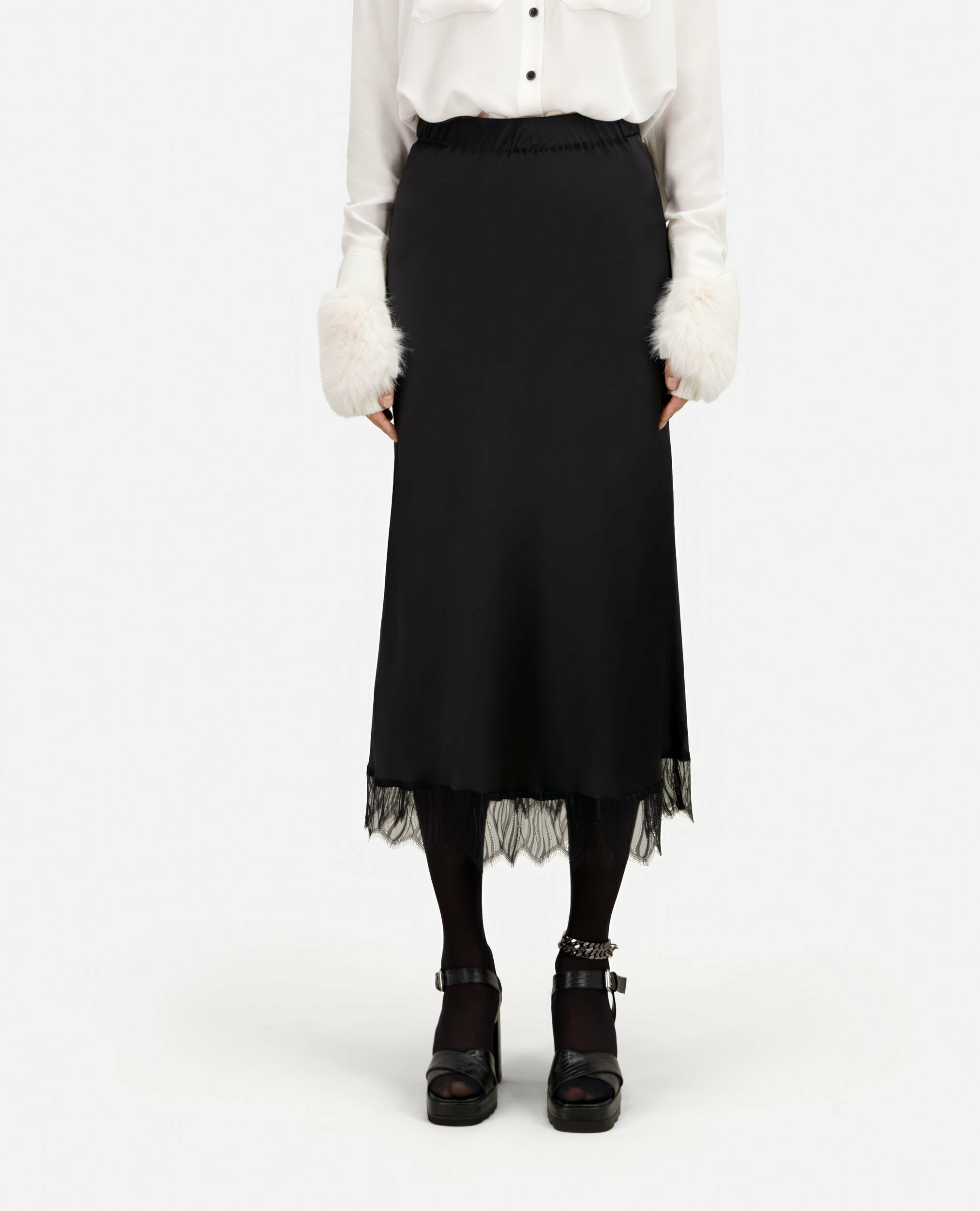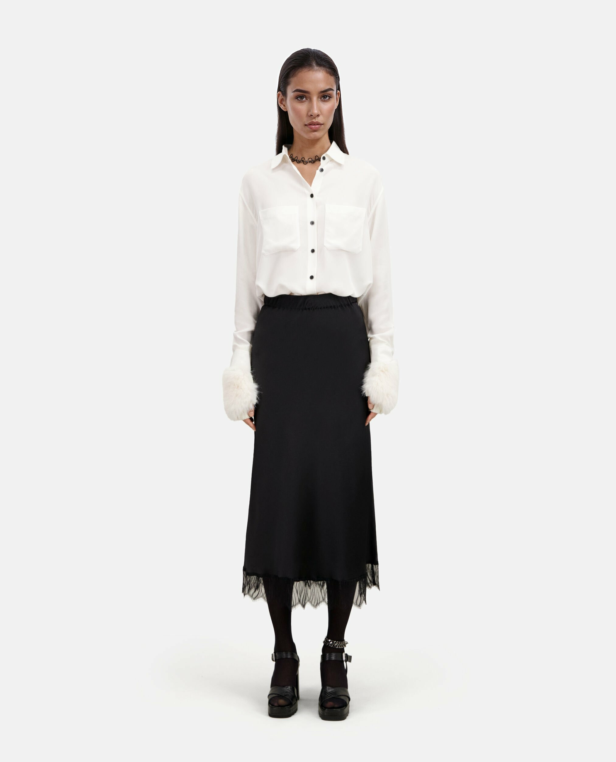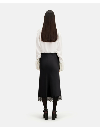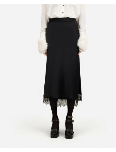 Conçue dans une coupe droite fluide, cette jupe épouse délicatement vos formes tout en offrant un confort optimal grâce à sa taille élastiquée. Le bas orné de dentelle noire fine ajoute un jeu de transparence subtil, révélant un style à la fois raffiné et audacieux. Facile à associer, elle s’adapte aussi bien à un look décontracté qu’à une tenue plus habillée.