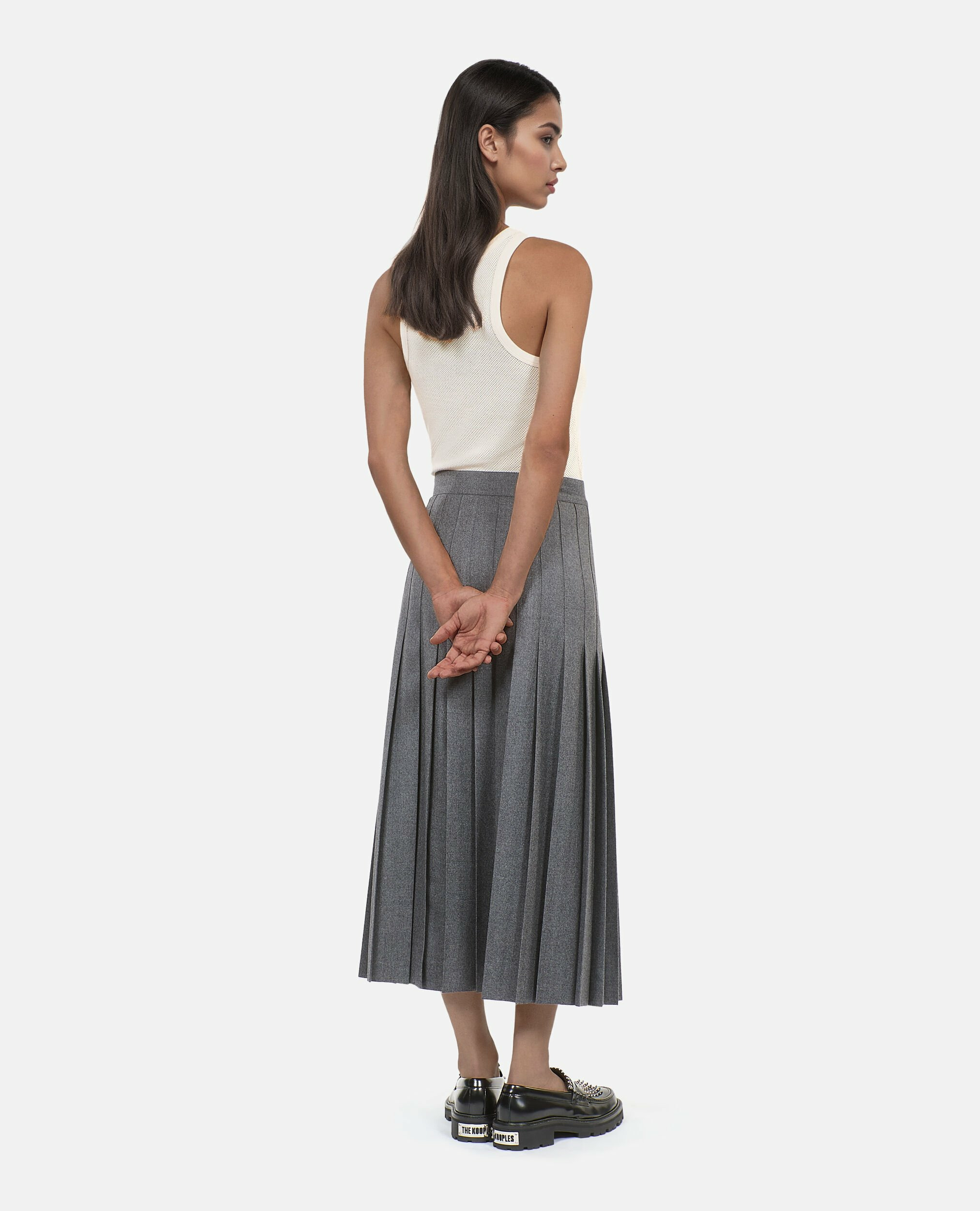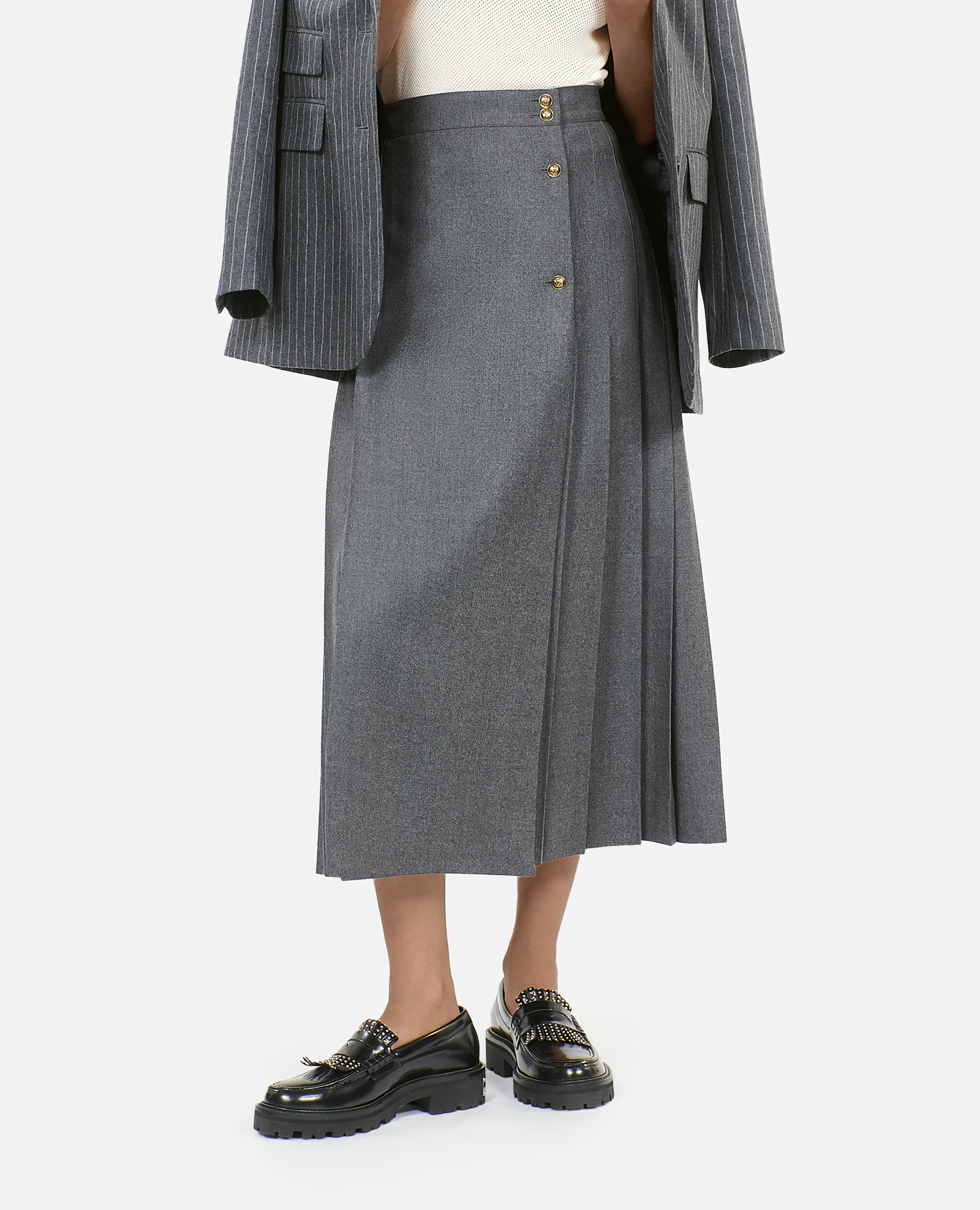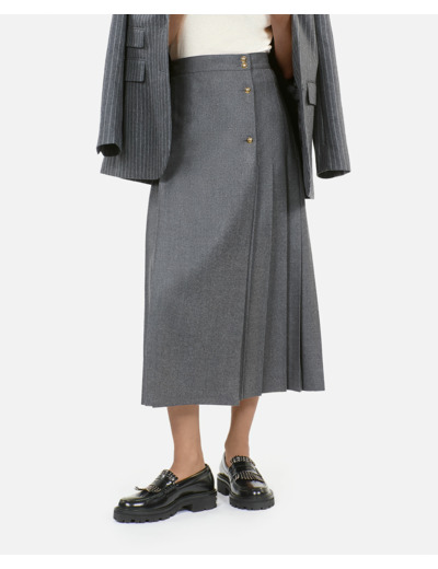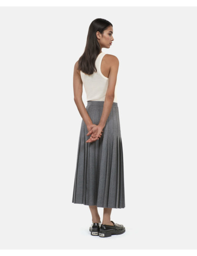 Sublimez votre silhouette avec cette jupe longue plissée en laine grise, une pièce élégante et intemporelle signée The Kooples. Son tombé fluide et sa texture raffinée apportent une touche sophistiquée à toutes vos tenues.
