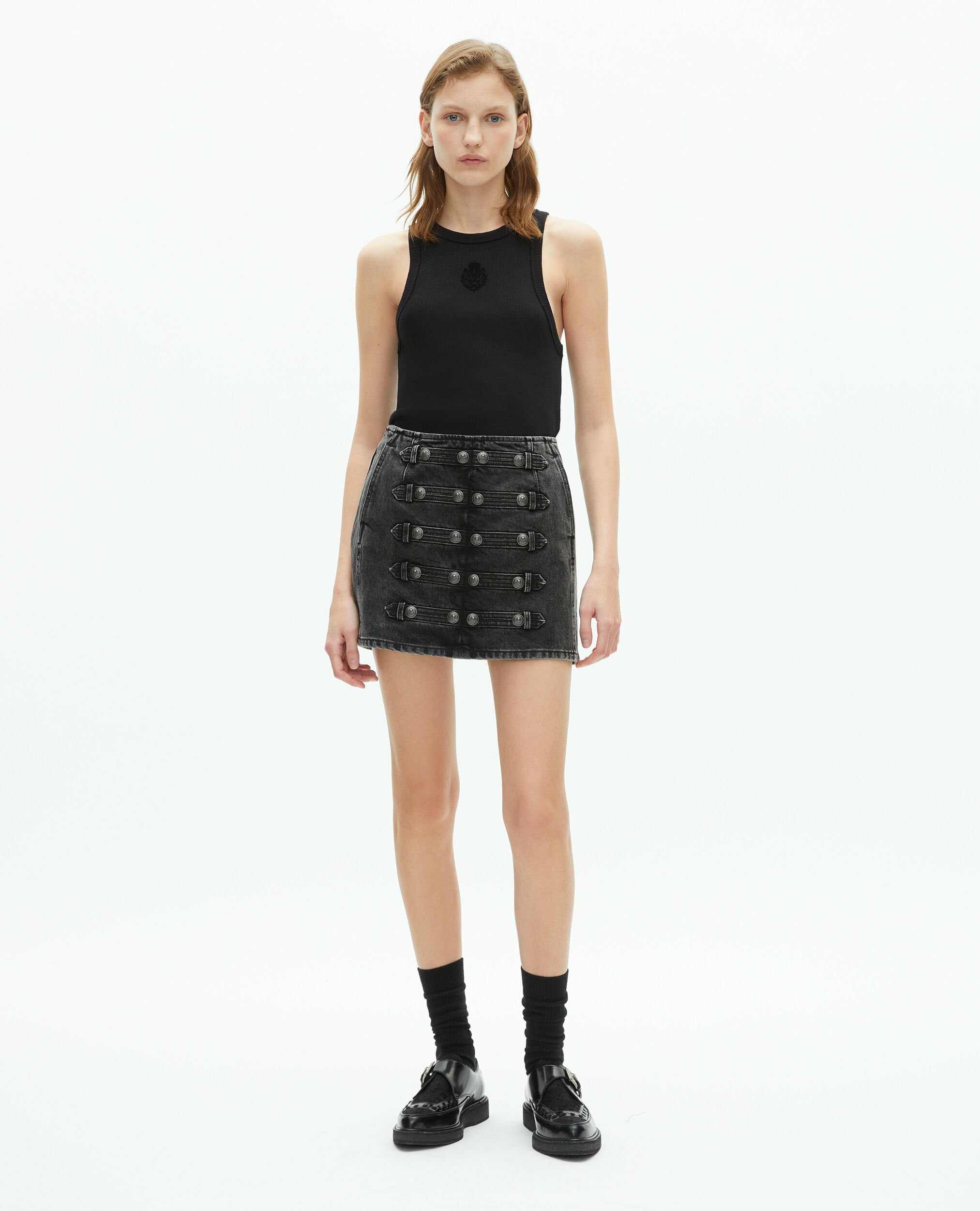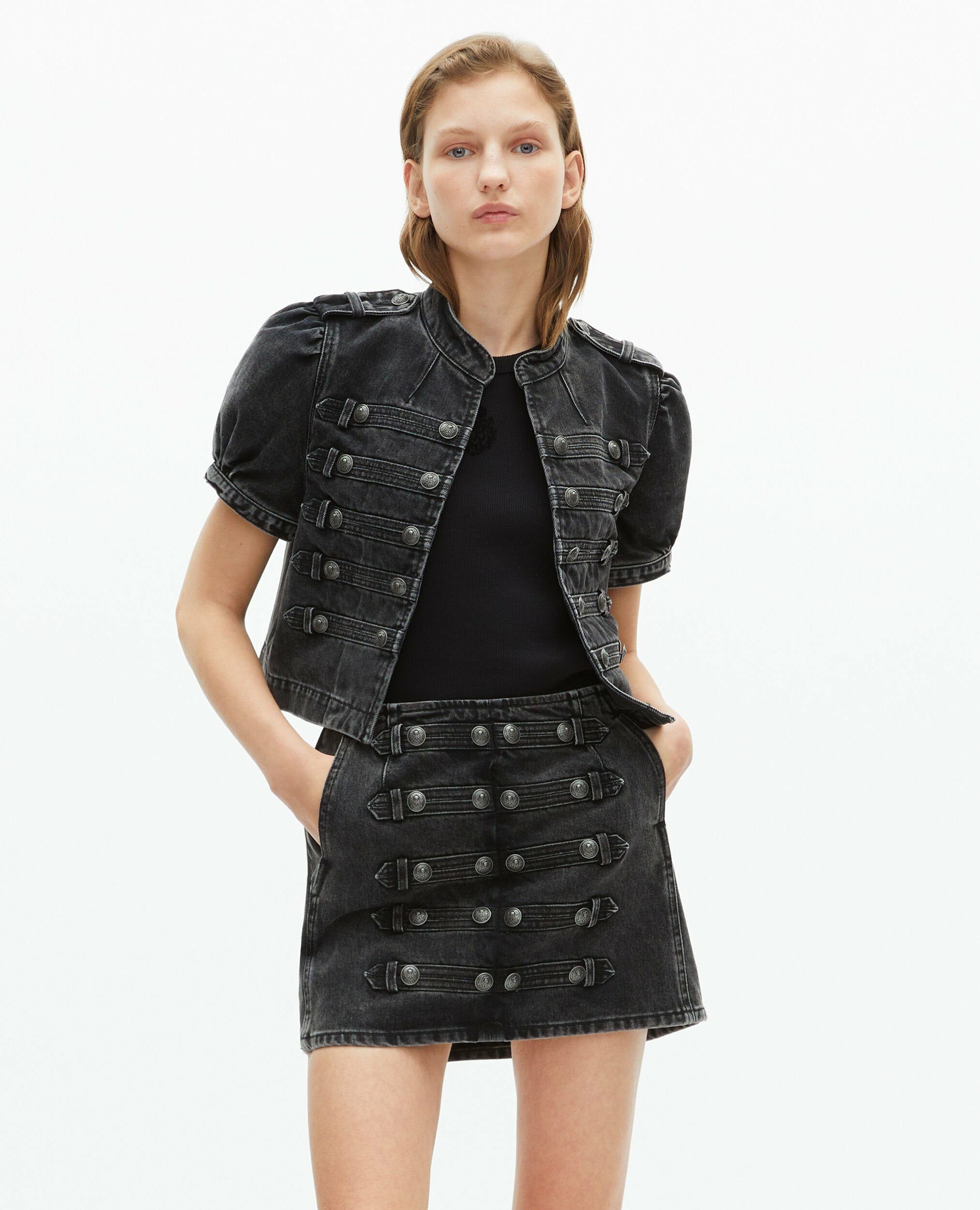 Affirmez votre style avec cette mini jupe en denim signée The Kooples, alliant modernité et détails militaires pour un look audacieux et raffiné. Une pièce incontournable qui s’adapte à toutes vos envies de mode.