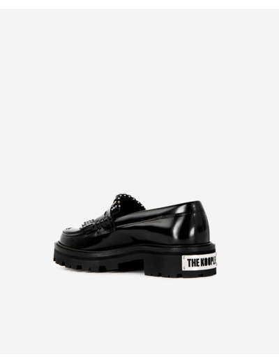 Mocassins en cuir glacé avec franges ornées de studs, semelle crantée avec studs sur la trépointe, plaque métallique logo au talon, hauteur de plateforme 3 cm. Doublure et semelle intérieure 100 % cuir mouton, extérieur 100 % cuir de vache, semelle extérieure en néolite.