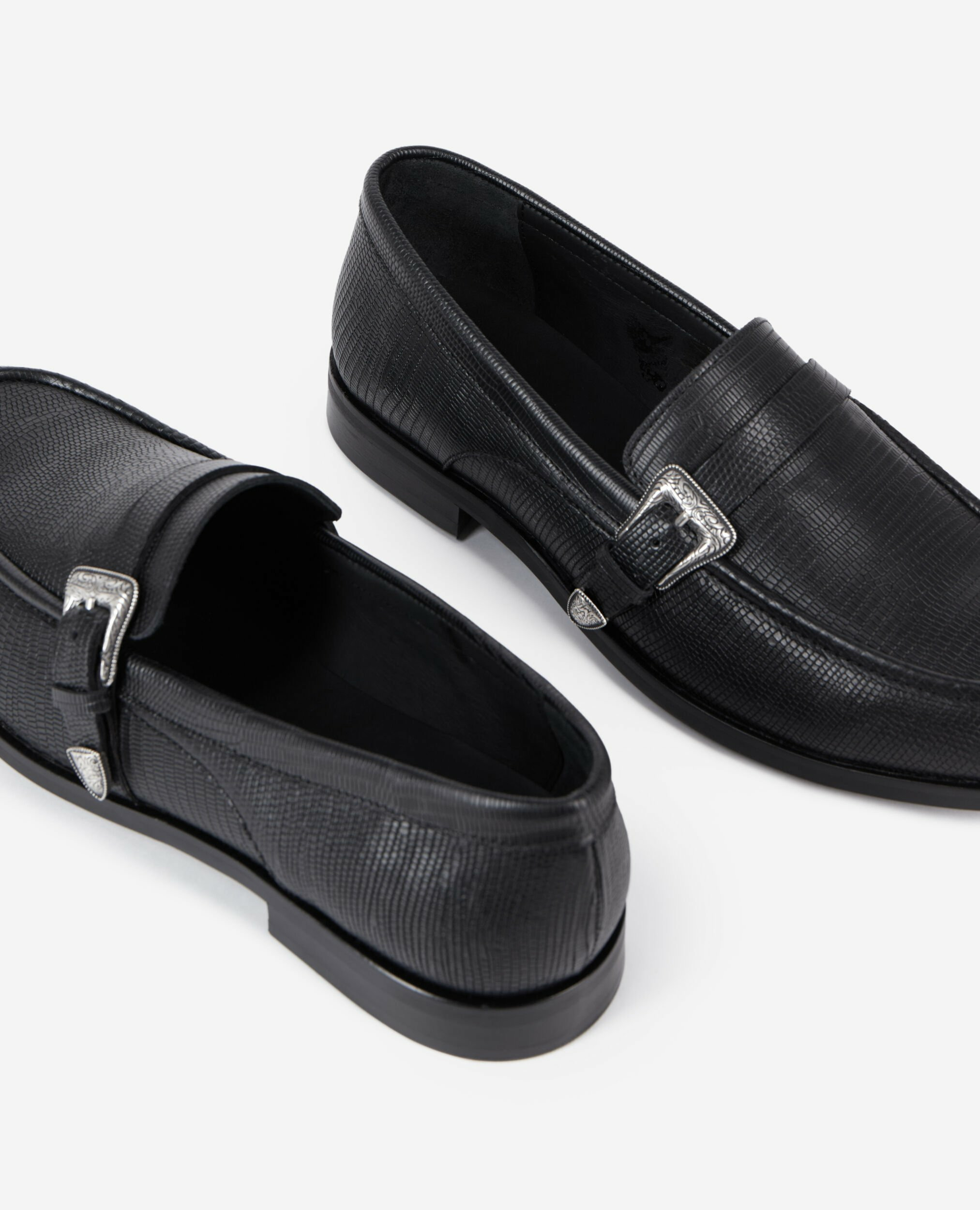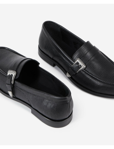 Mocassins homme The Kooples, cuir embossé effet lézard, boucle en métallerie argentée, hauteur talon 2 cm. Doublure, extérieur et semelle intérieure 100 % cuir de vache. Semelle extérieure en neolite.