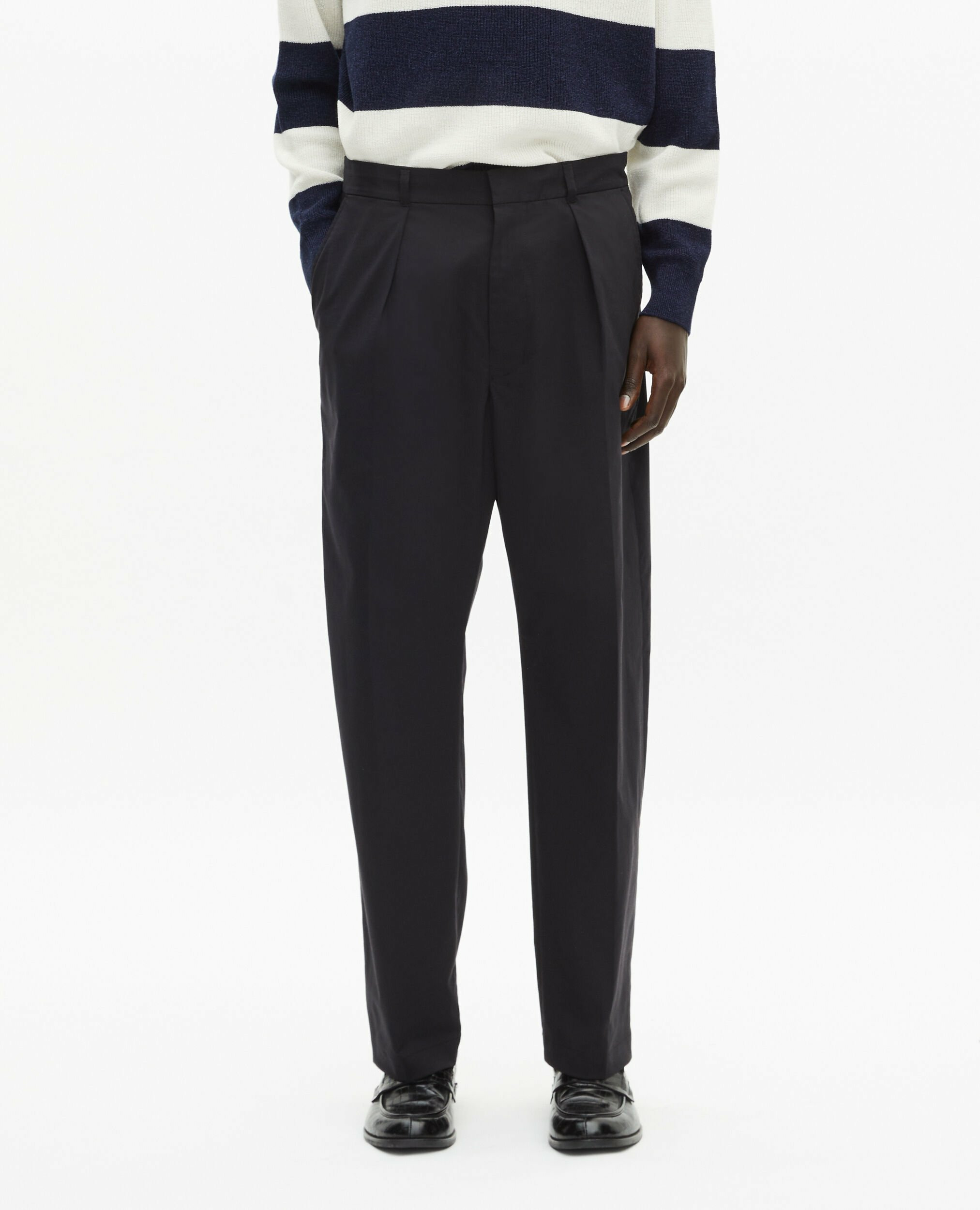 Confectionné dans un mélange de coton, polyester et élasthanne, ce pantalon offre une tenue impeccable tout en garantissant une grande liberté de mouvement. La taille avec pinces et la fermeture zippée avec agrafe assurent un ajustement précis et confortable. Les poches italiennes et passepoilées au dos ajoutent une touche fonctionnelle et raffinée, tandis que la broderie ton sur ton The Kooples souligne discrètement son caractère premium.