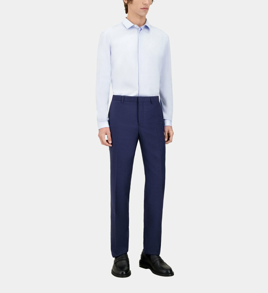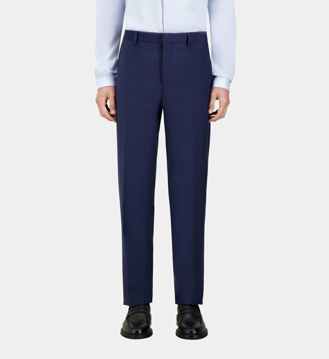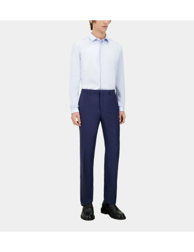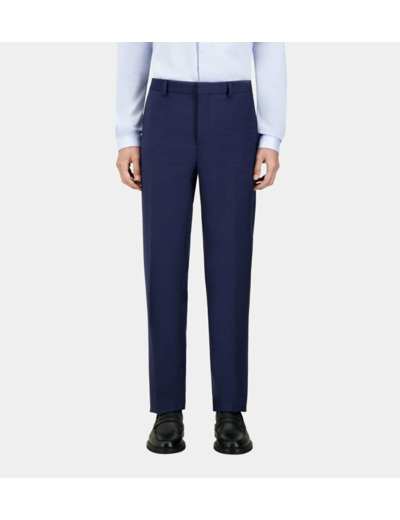 Coupe ajustée, taille classique avec passants, plis cassés avant et arrière, poches latérales italiennes, poches dos passepoilées, fermeture zippée avec bouton de rappel et agrafe, tissu italien.
