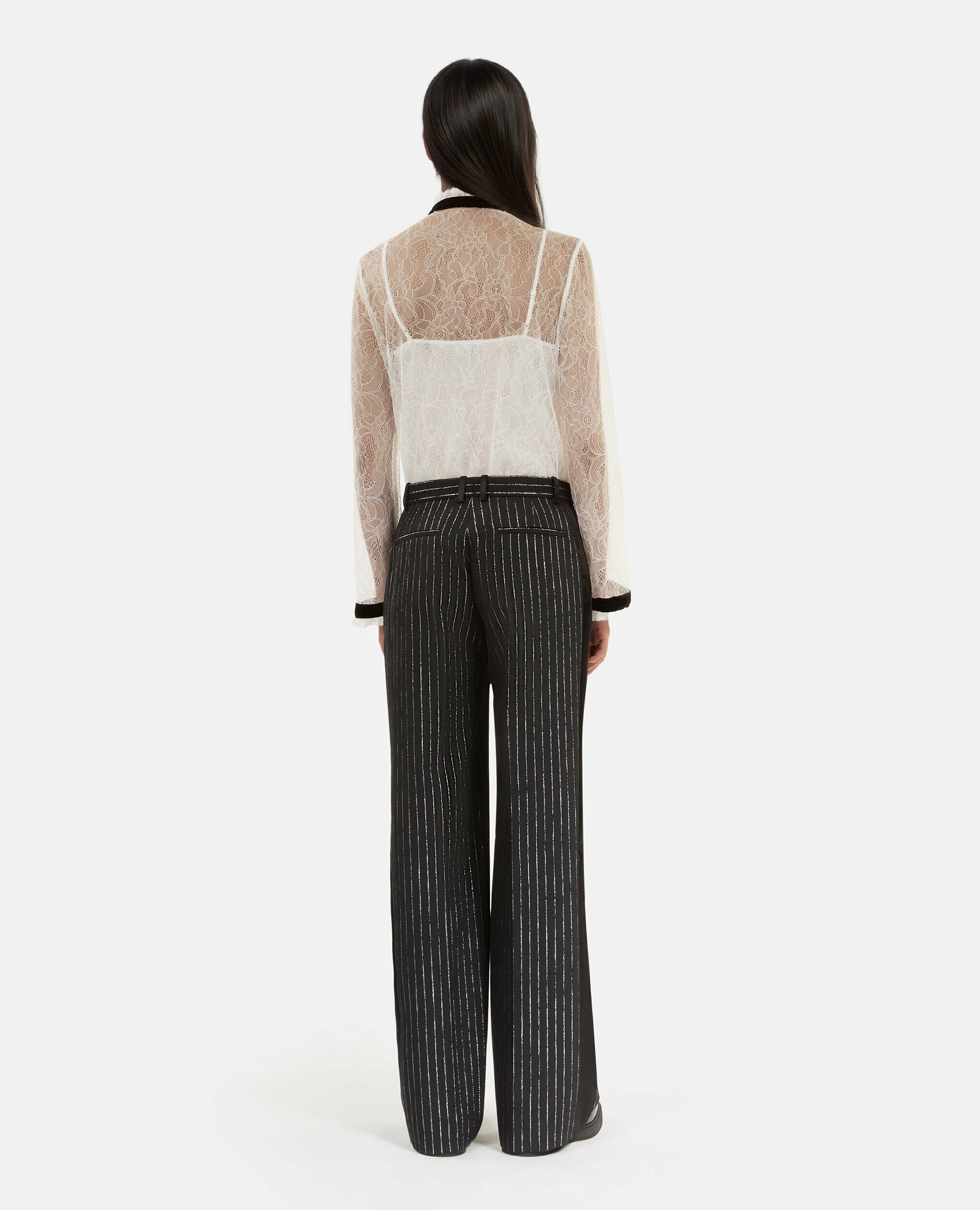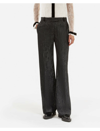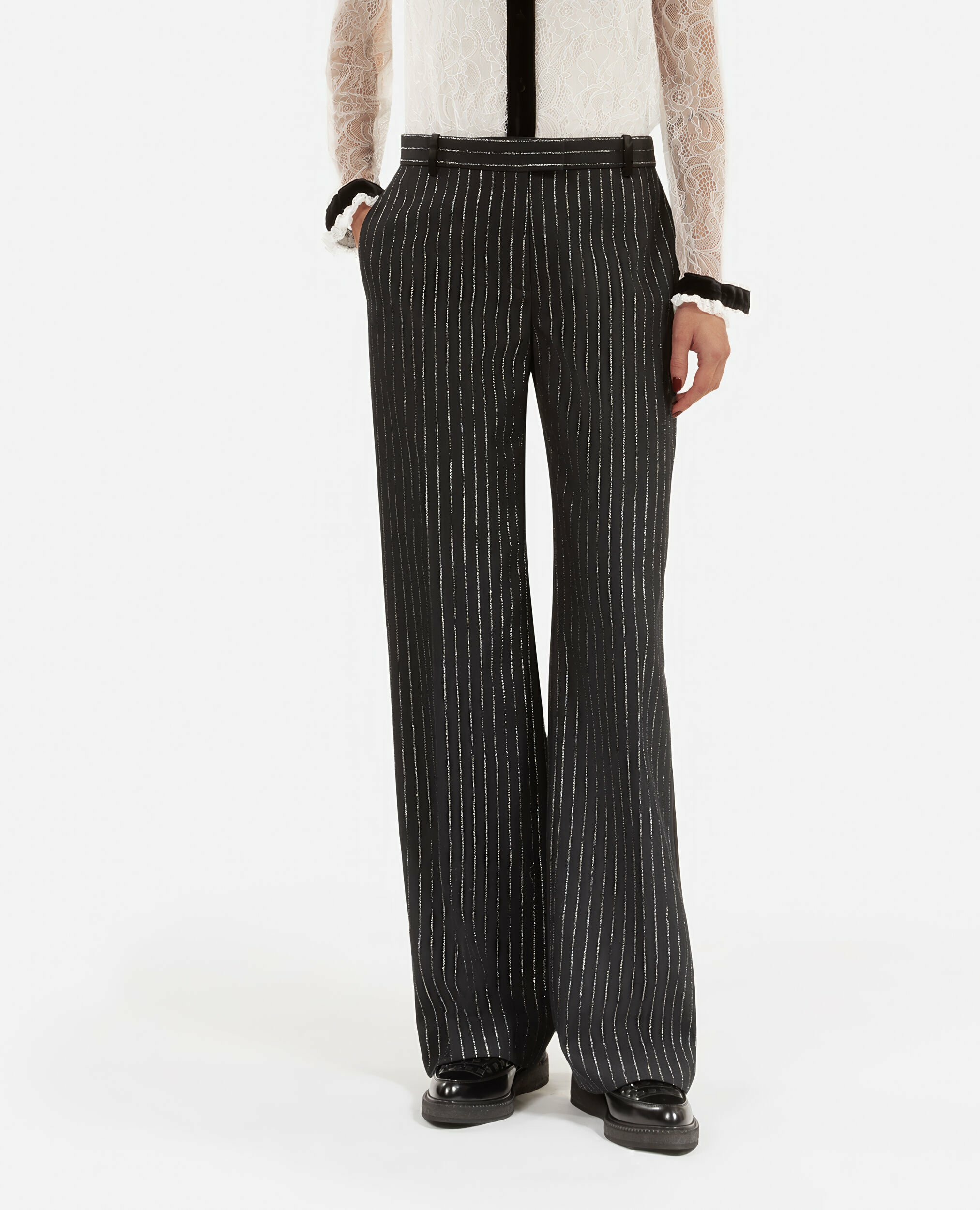 Pantalon femme The Kooples, taille moyenne avec passants, jambe droite, bandes en satin sur les côtés, fermeture zippée avec bouton de rappel et agrafe, poches latérales italiennes, poches passepoilées au dos.