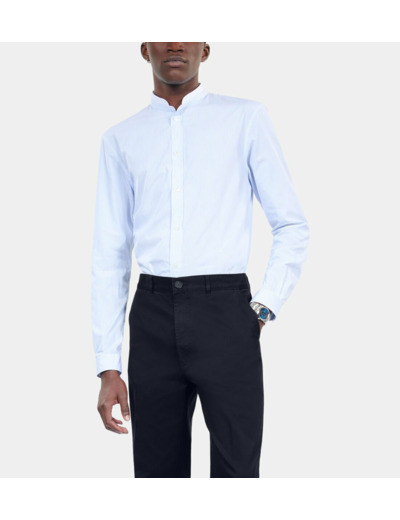 Conçu pour l’homme contemporain, ce pantalon affiche une taille moyenne avec passants, idéale pour un port ceinturé ou libre. Sa jambe large offre une silhouette fluide et une liberté de mouvement optimale, tandis que les poches latérales invisibles et les poches dos passepoilées apportent une finition soignée et pratique. Le bleu marine profond s’adapte à toutes vos tenues, du bureau aux sorties urbaines.