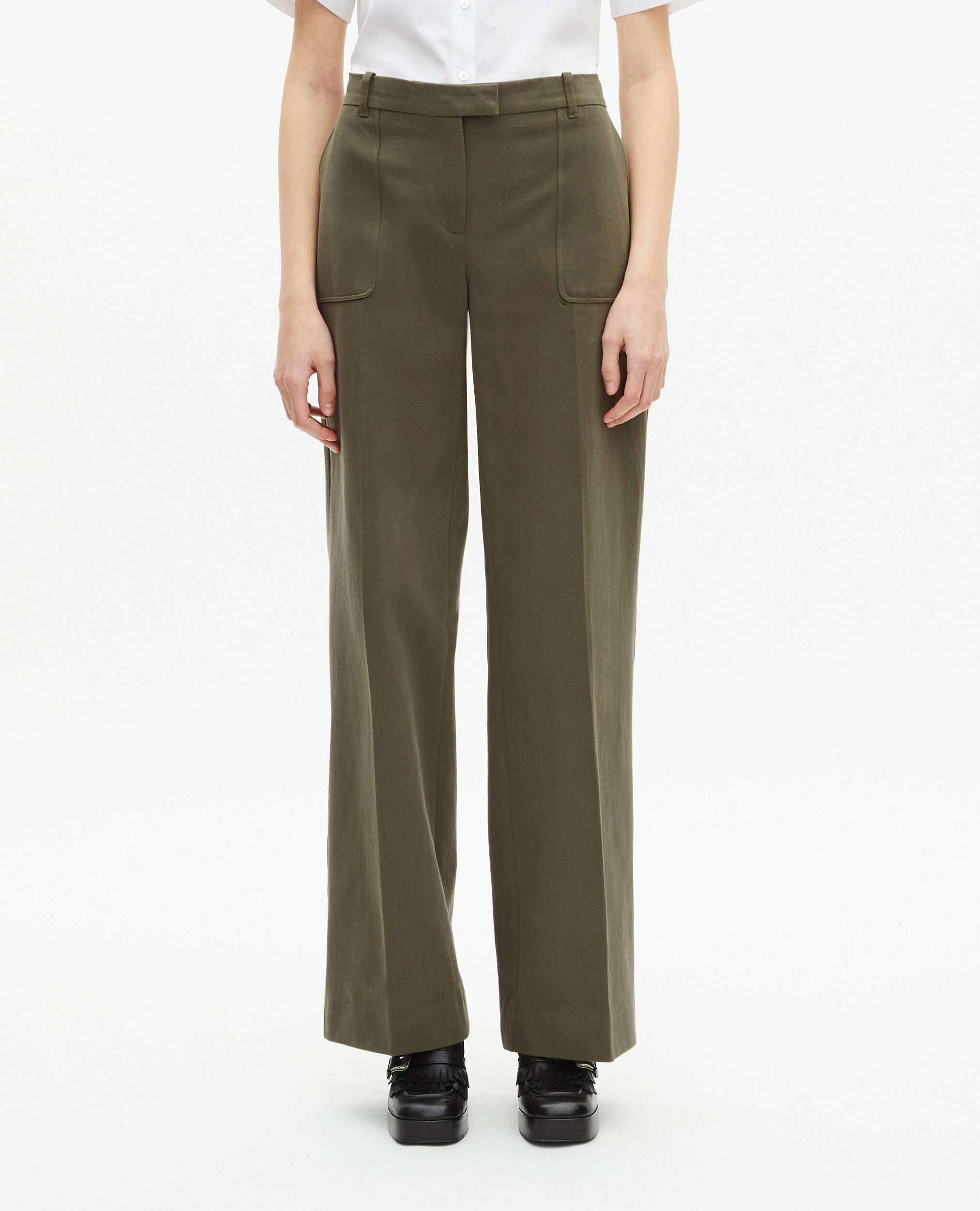 Réponse. Il s’agit d’un pantalon large avec une taille moyenne et des plis au milieu devant et dos pour une silhouette structurée.