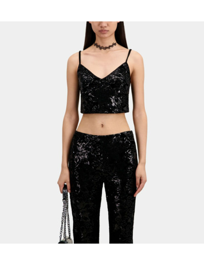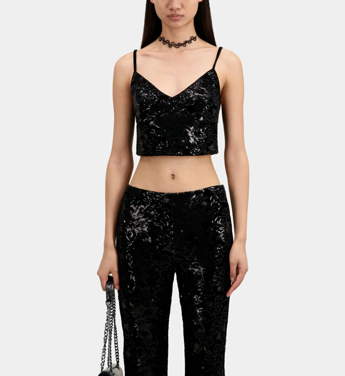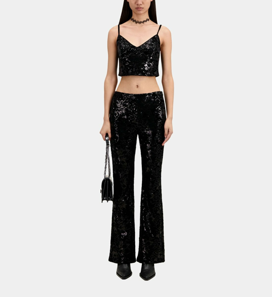 Affirmez votre style avec ce pantalon noir en velours orné de sequins, une pièce qui allie élégance et audace. Sa coupe flare et sa taille haute subliment la silhouette tout en offrant un confort optimal.
