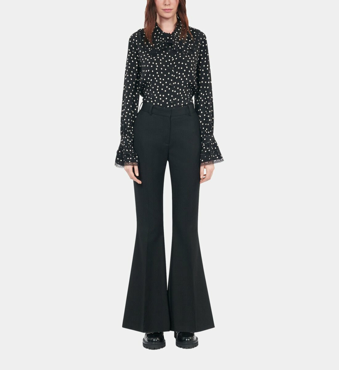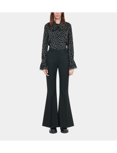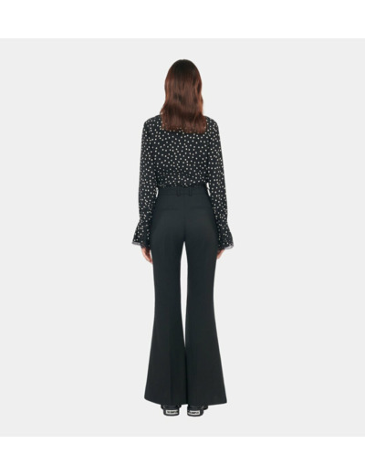 Adoptez l’élégance intemporelle avec ce pantalon tailleur en laine mélangée noir signé The Kooples. Une pièce sophistiquée qui sublime la silhouette avec une coupe ajustée et une jambe flare moderne.
