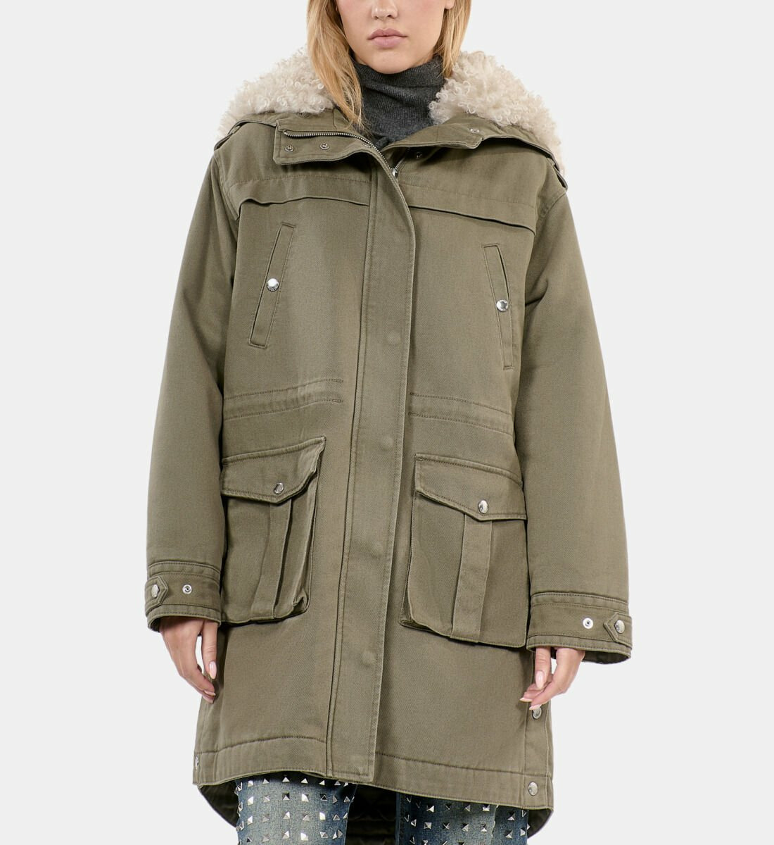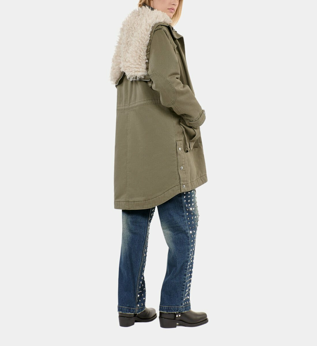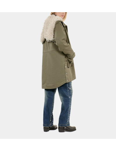 Cette parka est composée d’un extérieur 100% coton, d’une doublure mêlant polyester et viscose, et d’une fausse fourrure en polyester. Son entretien demande un soin particulier : lavage interdit, pas de blanchiment, séchage en tambour interdit, repassage limité à 110° et nettoyage à sec avec solvants normés.