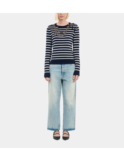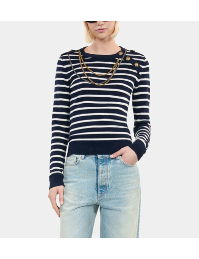 Adoptez l’élégance intemporelle avec ce pull en laine à rayures, une pièce essentielle pour sublimer votre garde-robe hivernale. Alliant style graphique et confort naturel, il incarne le chic décontracté à la française.