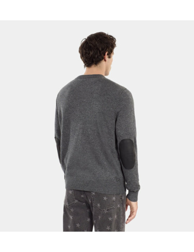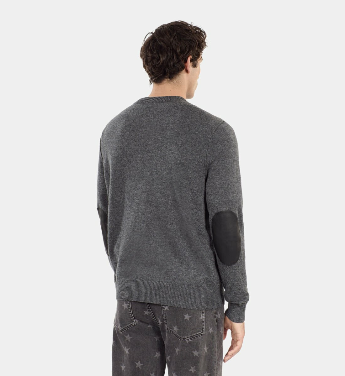 Ce pull se distingue par ses manches longues agrémentées de coudières en cuir d’agneau, apportant une touche de sophistication et de durabilité. La broderie ton sur ton et les bords côtes renforcent son caractère raffiné, tandis que la laine naturelle assure une chaleur douce et respirante, idéale pour l’hiver.