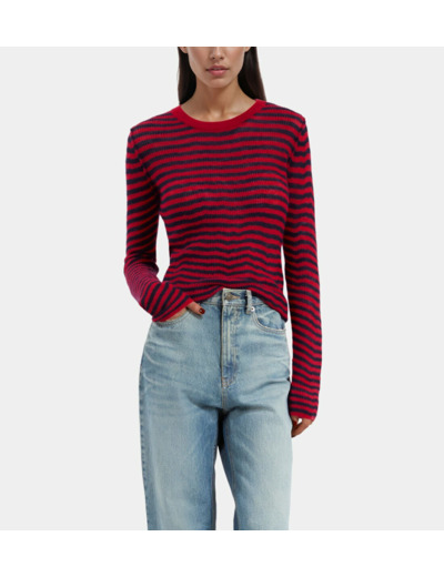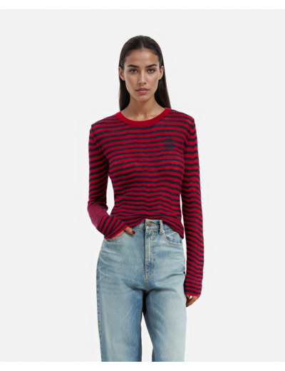 Confectionné dans un mélange raffiné de mohair, laine et polyamide, ce pull offre une texture légère et chaleureuse, idéale pour affronter les journées fraîches sans compromis sur le confort. Ses rayures graphiques apportent une dynamique visuelle qui s’adapte aussi bien à un look casual qu’à une tenue plus sophistiquée.