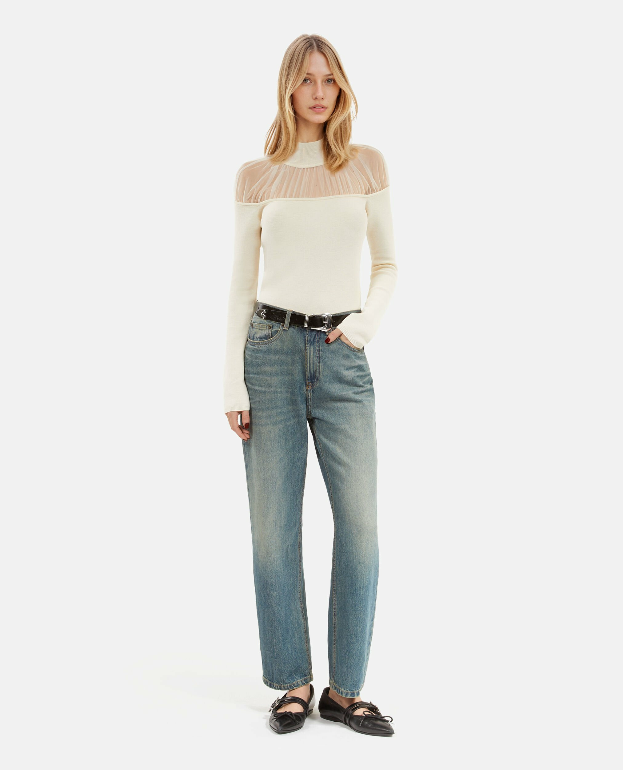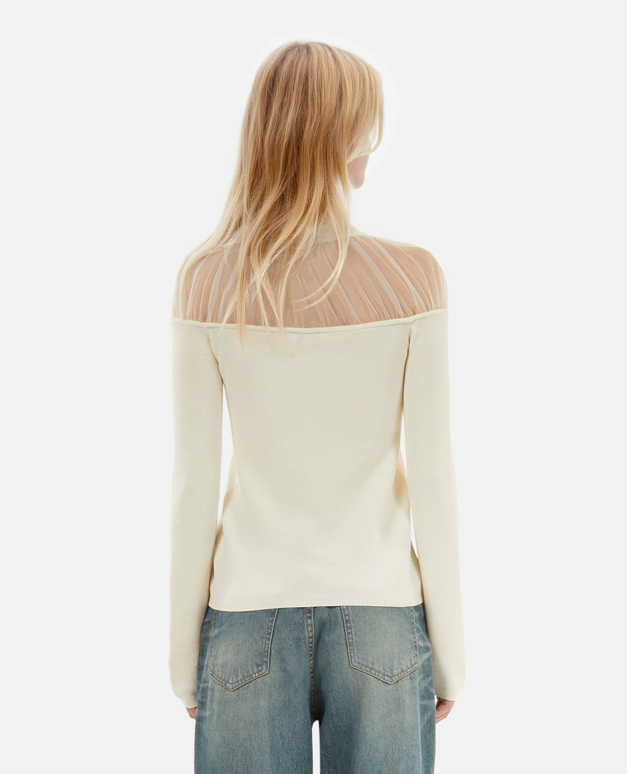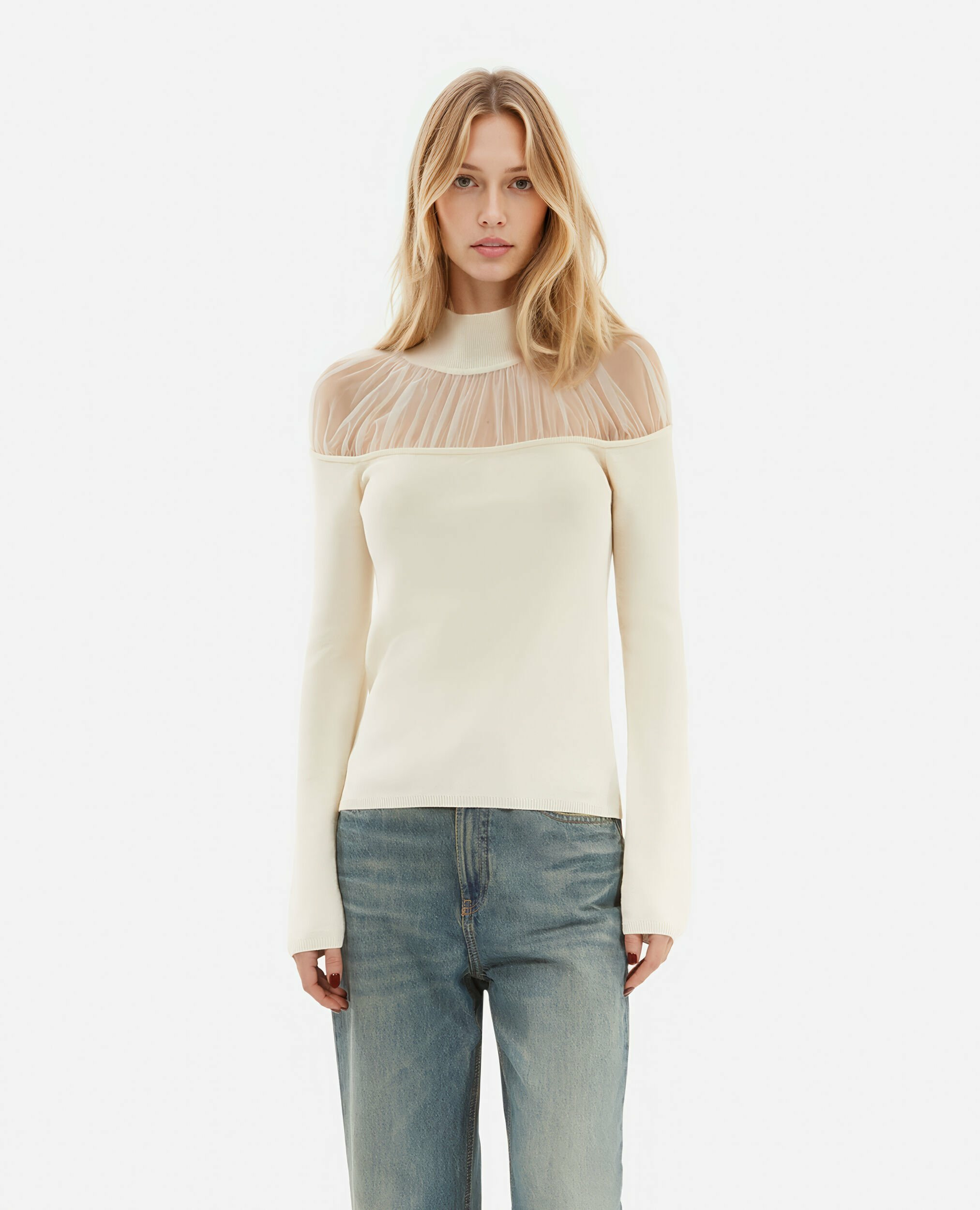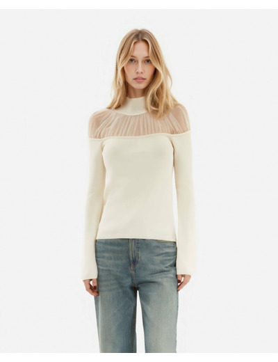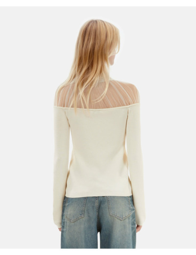 Conçu pour épouser parfaitement la silhouette, ce pull ajusté sublime votre allure tout en offrant un confort optimal. La transparence délicate du col en tulle crée un jeu de textures qui dynamise votre look, idéal pour passer du bureau à une soirée en toute simplicité. Sa coupe étudiée met en valeur chaque mouvement, révélant une féminité affirmée et contemporaine.