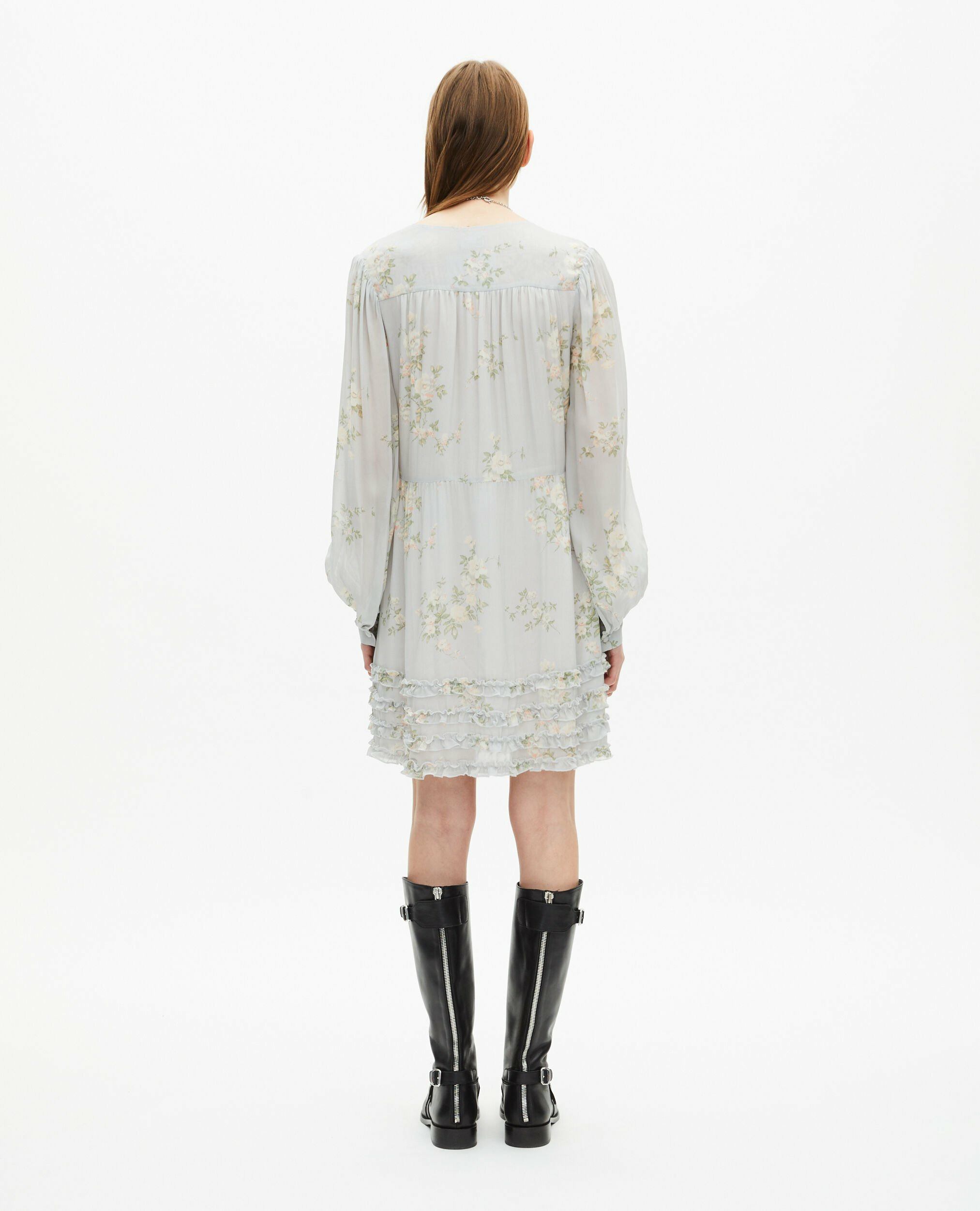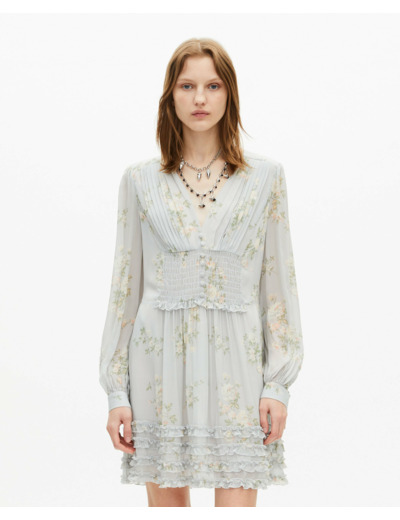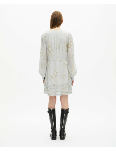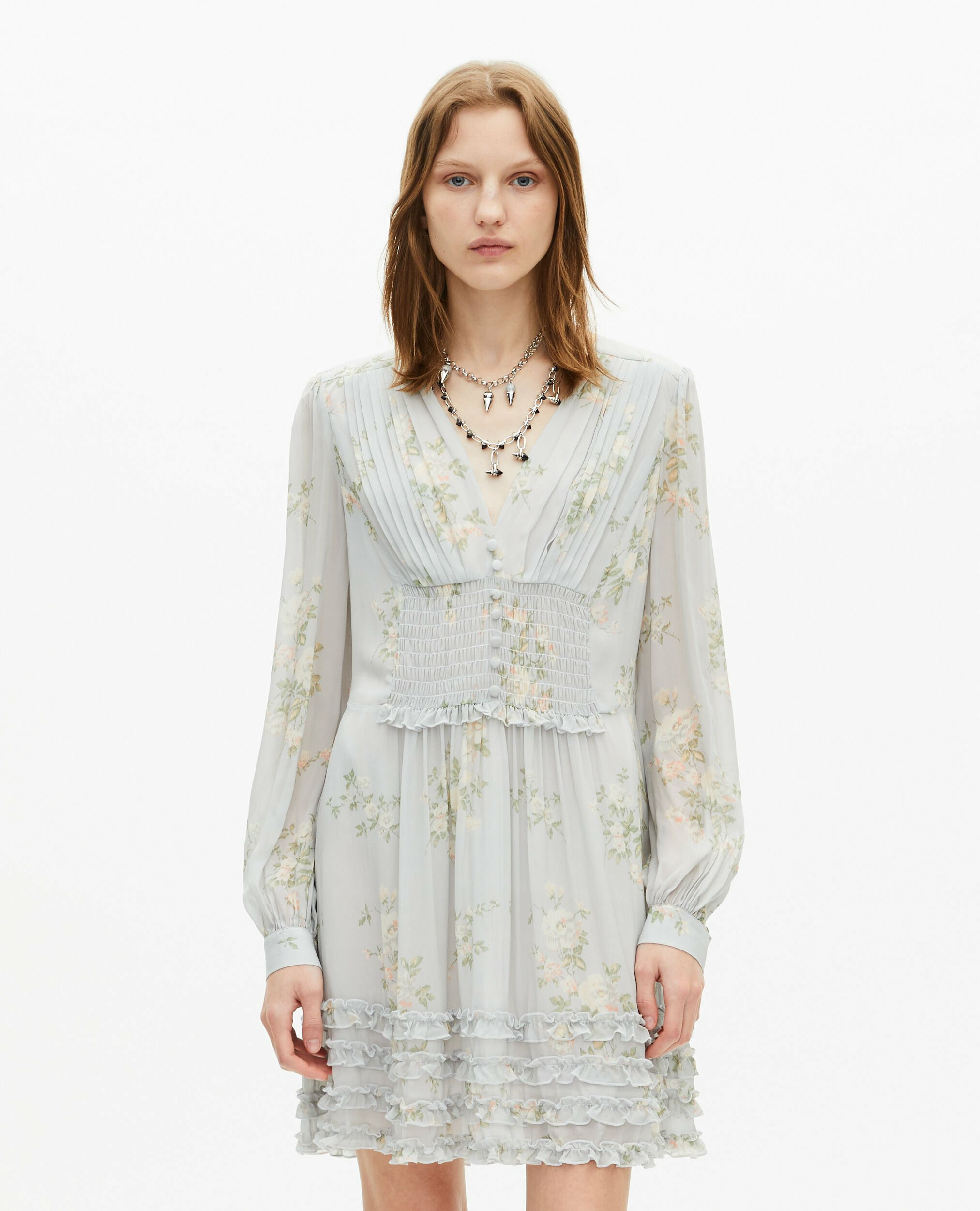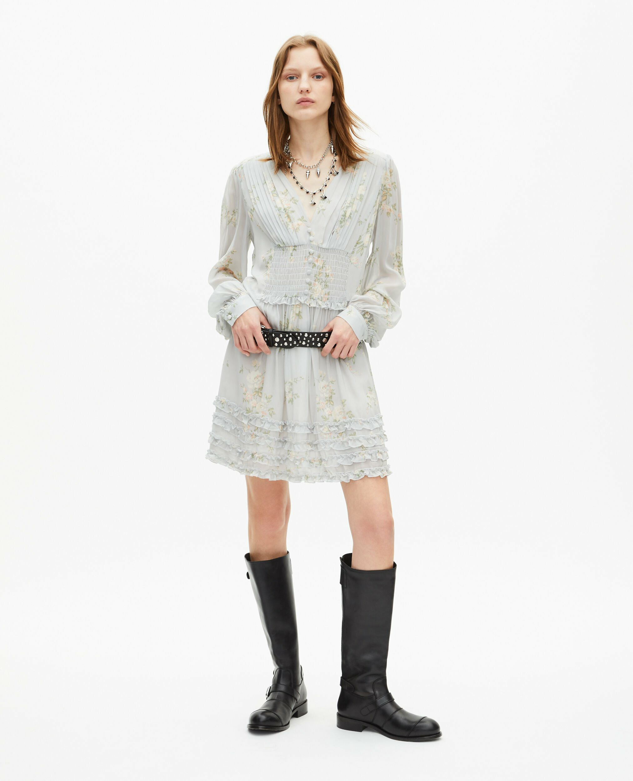 Cette robe est composée de matériaux soigneusement sélectionnés par The Kooples. Elle est doublée et présente une longueur de 89,4 cm pour une taille 36. Les manches longues sont finies par un serrage aux poignets, la taille est ajustée avec fronces et boutons, et le bas est volanté pour plus de légèreté.