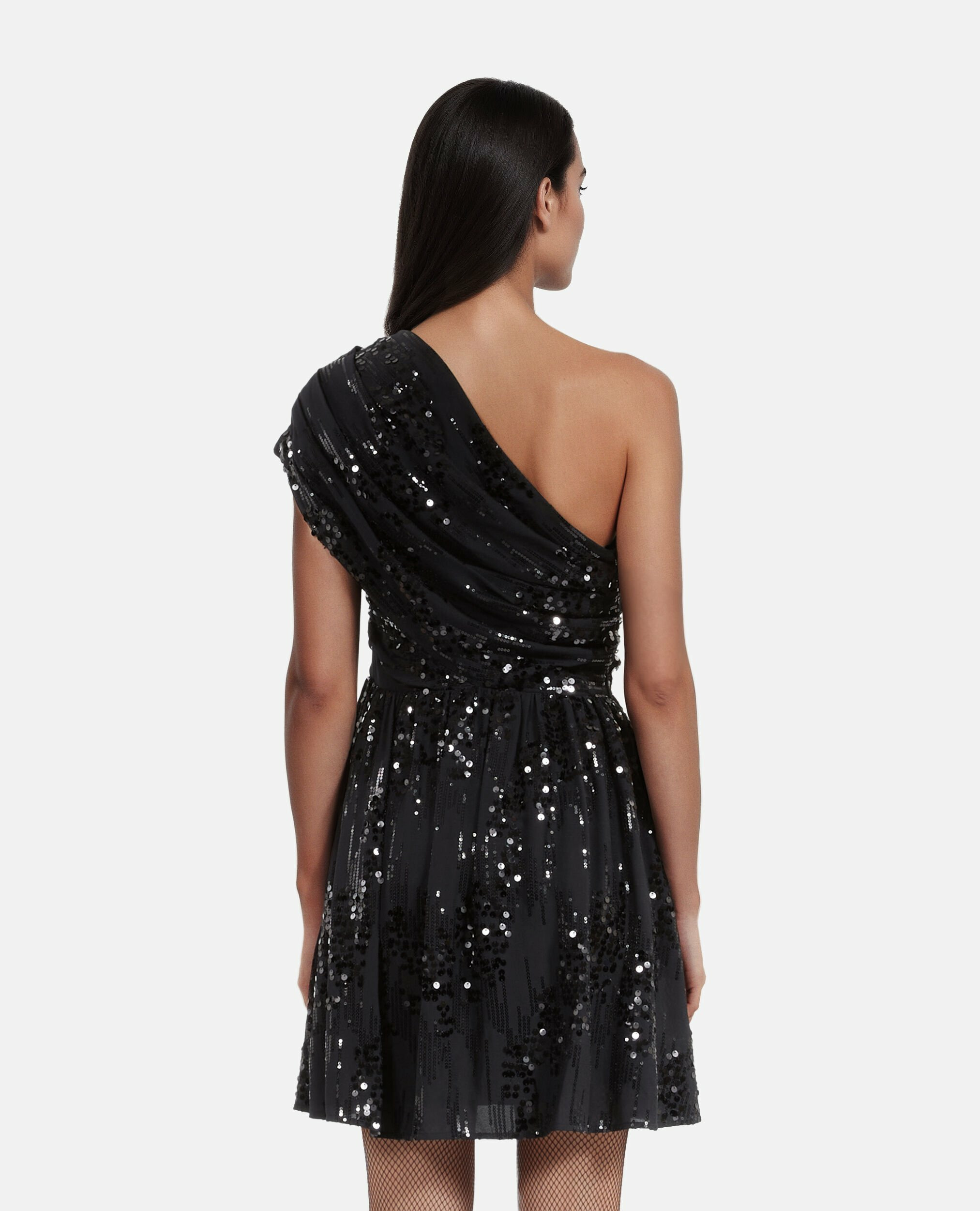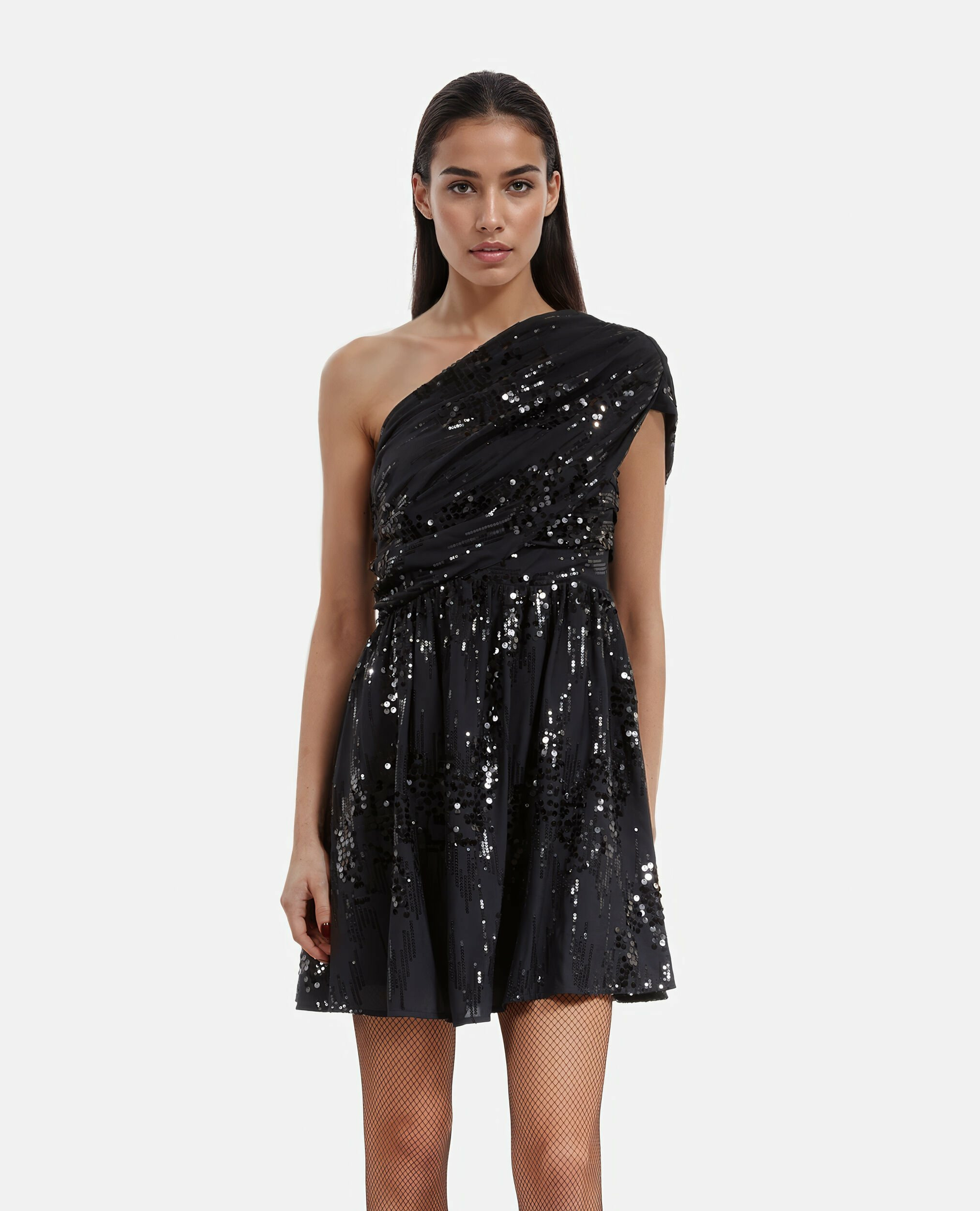 Brillez intensément lors de vos soirées avec cette robe courte à sequins noire signée The Kooples. Son effet drapé asymétrique sublime la silhouette avec élégance et modernité.