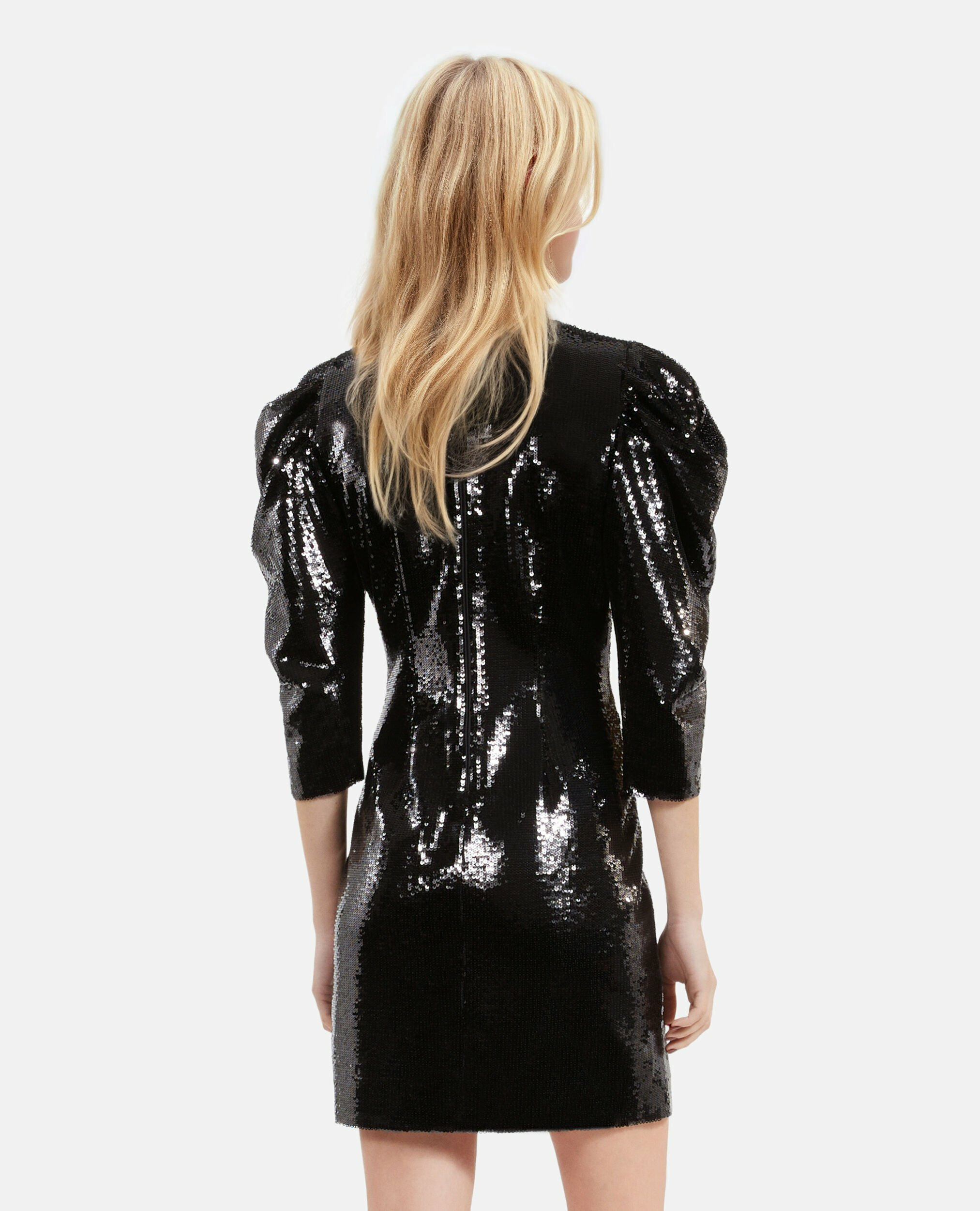 Conçue pour épouser parfaitement la silhouette, cette robe dévoile un décolleté en V profond et des manches gigot trois quarts qui apportent une touche de caractère. Les sequins brodés captent la lumière à chaque mouvement, tandis que la fermeture zippée au dos assure un maintien optimal. Sa longueur de 86,5 cm pour une taille 36 équilibre parfaitement modernité et féminité.