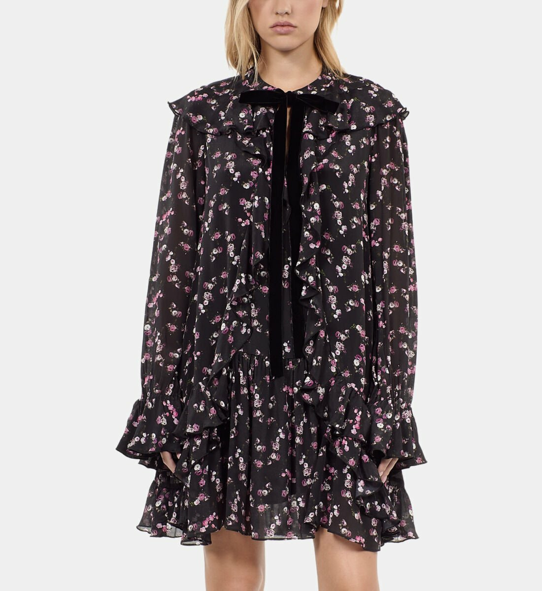 Laissez-vous séduire par l’élégance légère de cette robe courte à volants, sublimée par un imprimé floral délicat. Une pièce signée The Kooples qui allie modernité et féminité avec une aisance naturelle.