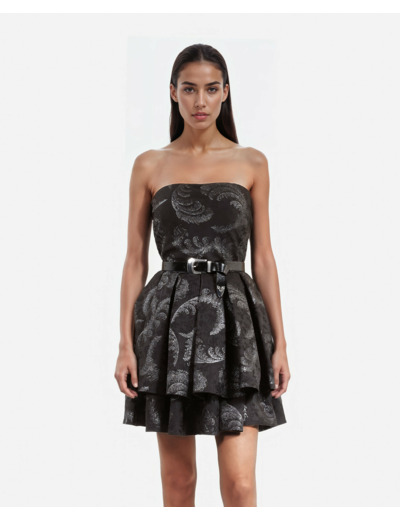 Affirmez votre élégance avec cette robe courte bustier en jacquard noir signée The Kooples. Une pièce sculpturale qui allie audace et raffinement pour sublimer vos soirées.