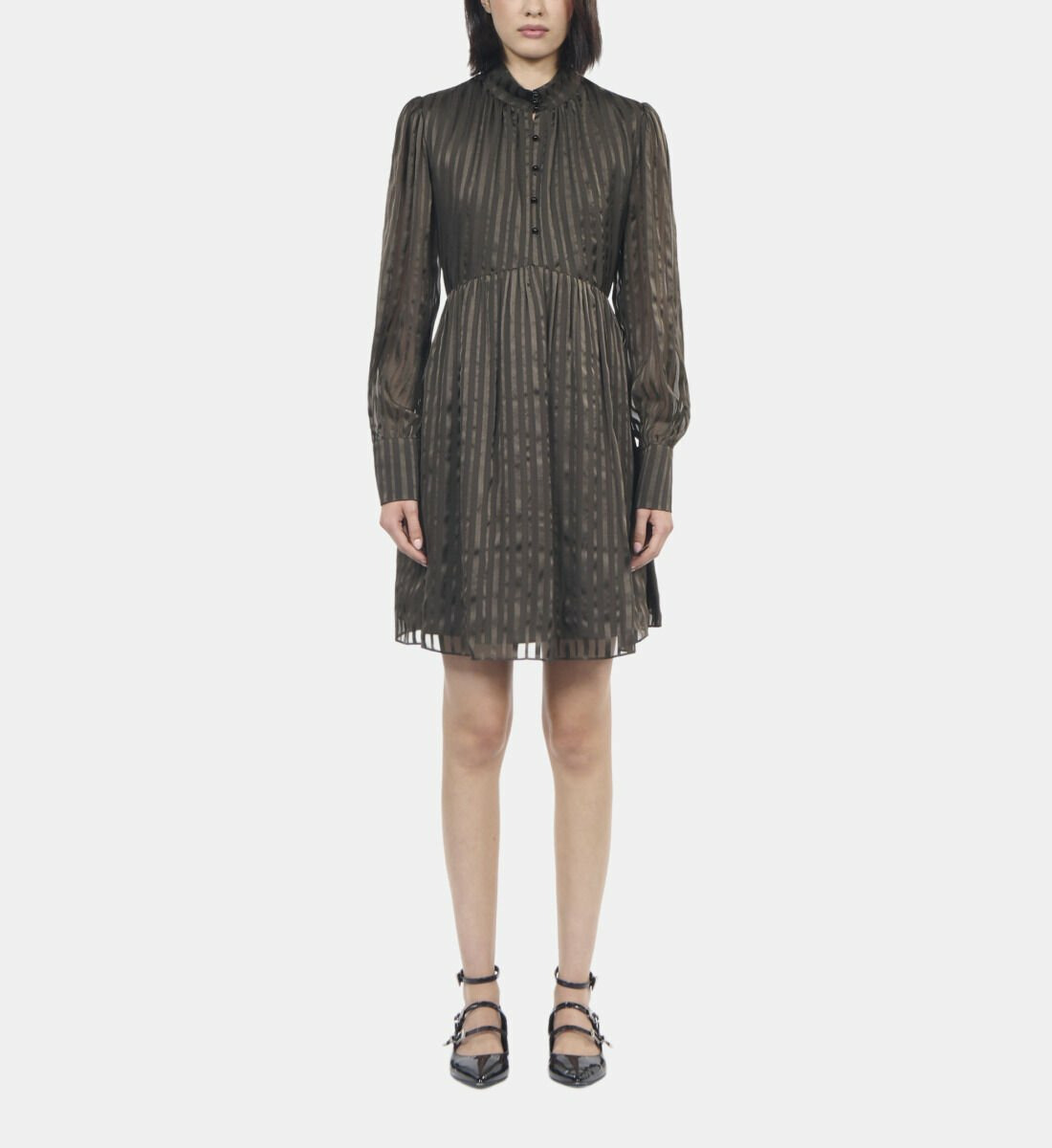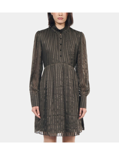 Conçue pour les femmes qui recherchent sophistication et confort, cette robe se distingue par son col montant et ses manches longues délicatement ajourées. Le boutonnage devant apporte une touche de charme discret tandis que la doublure assure un tombé parfait et un confort optimal. Sa longueur de 90,5 cm pour une taille 36 souligne subtilement les jambes, idéale pour une allure chic en toute occasion.