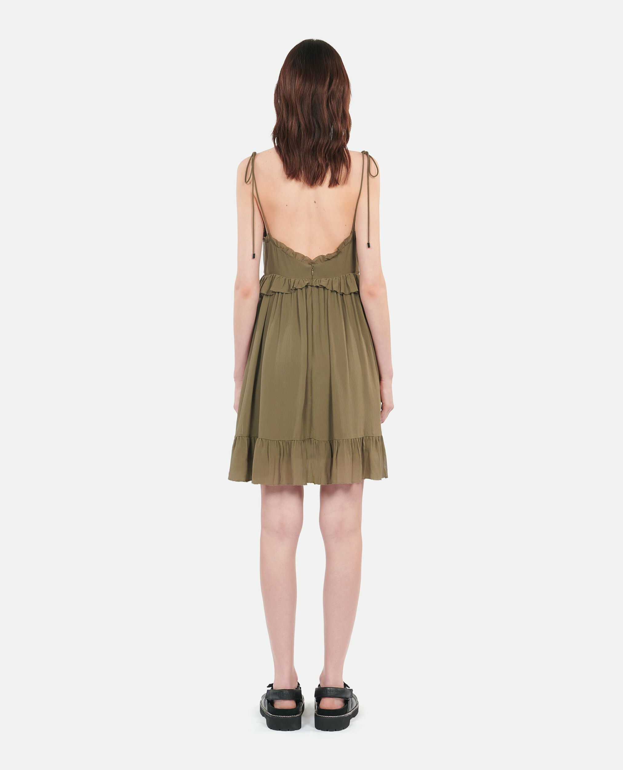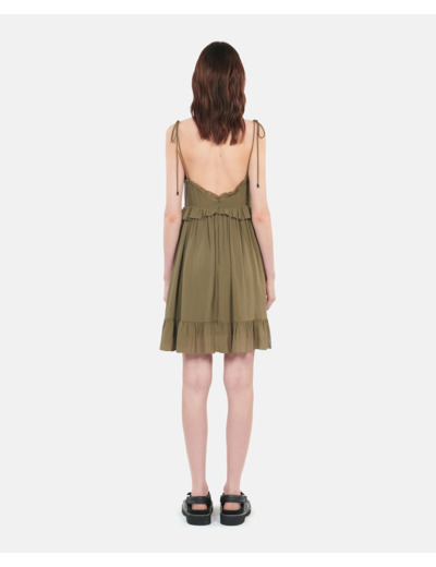 Sublimez votre silhouette avec cette robe courte kaki en soie signée The Kooples, une pièce alliant élégance et légèreté. Son coloris profond et ses détails raffinés en font un incontournable de votre garde-robe estivale.